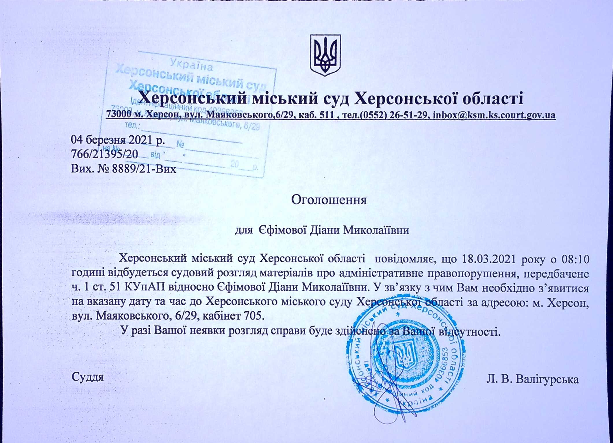 ОГОЛОШЕННЯ для Єфімової Діани Миколаївни