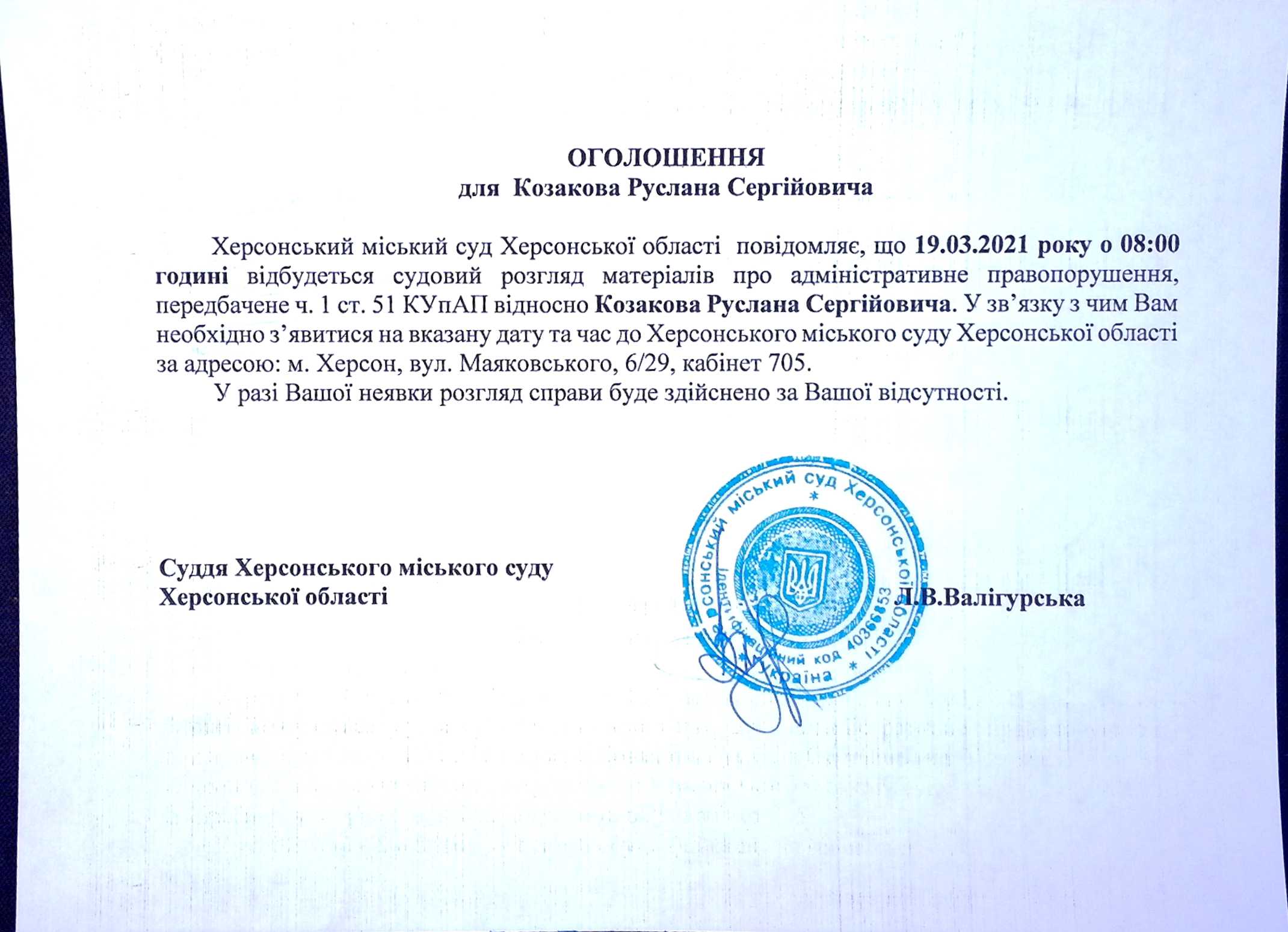 ОГОЛОШЕННЯ ПРО ВИКЛИК ДО СУДУ