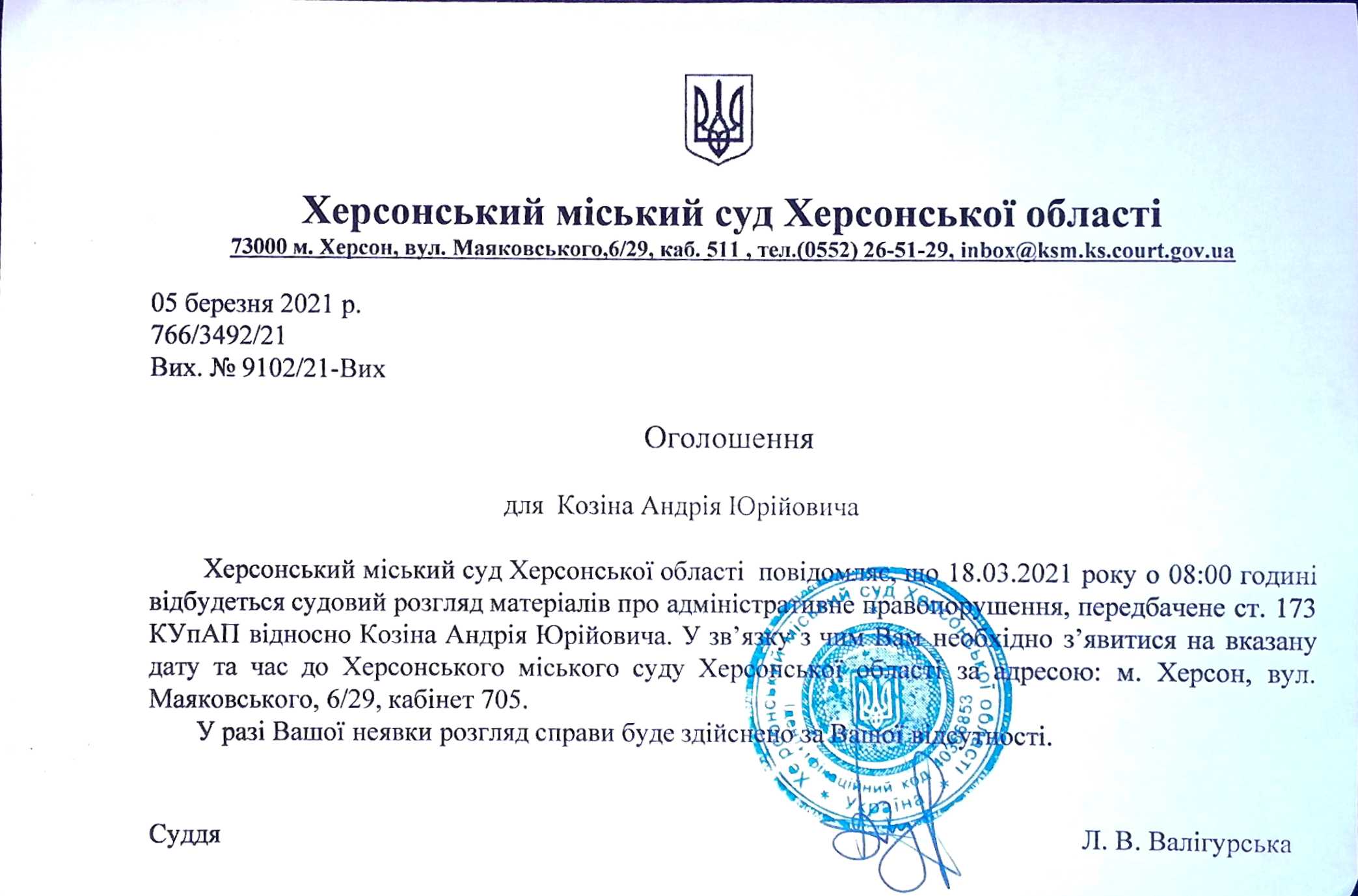 ОГОЛОШЕННЯ для Козіна Андрія Юрійовича