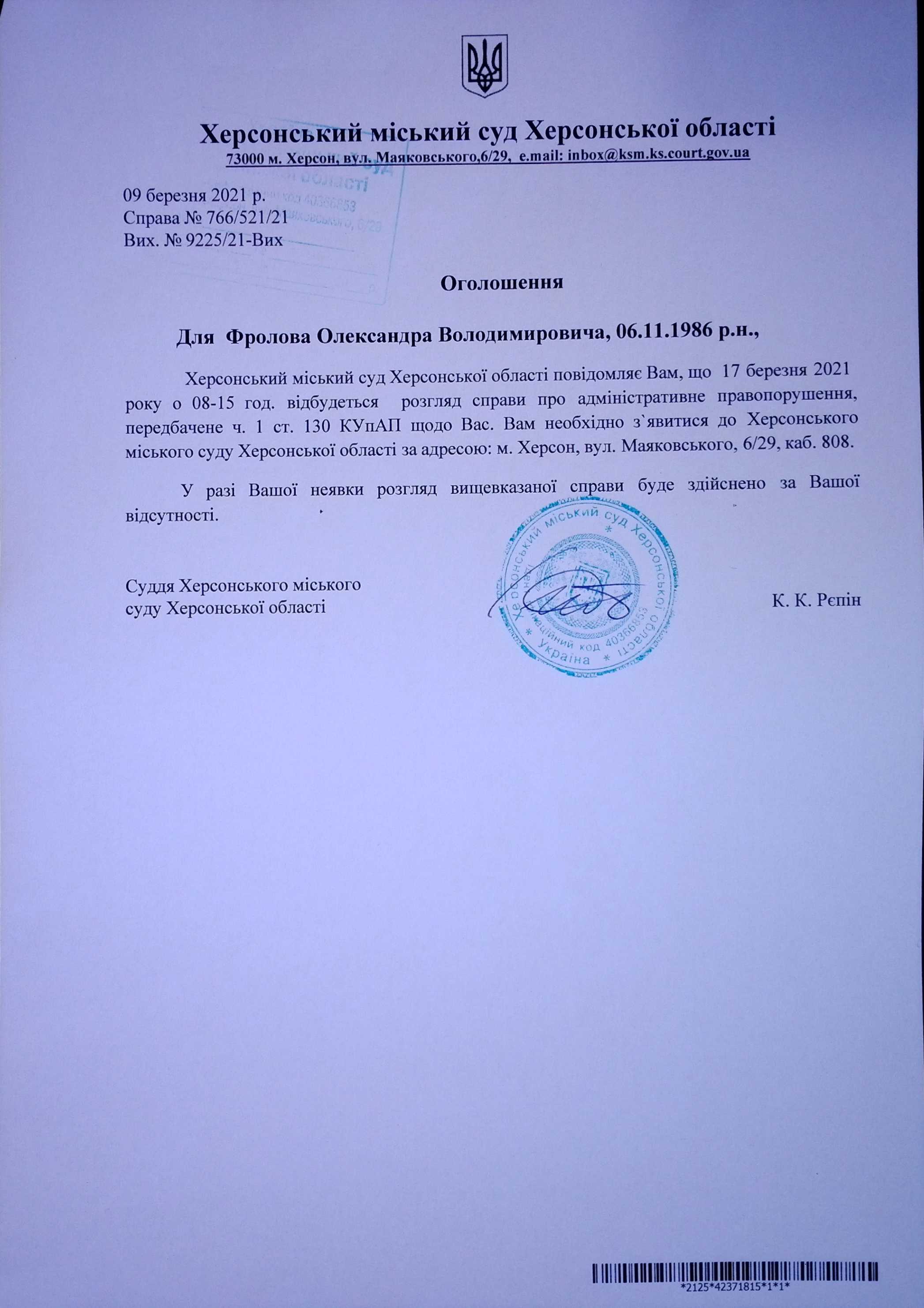 ОГОЛОШЕННЯ для Фролова Олександра Володимировича