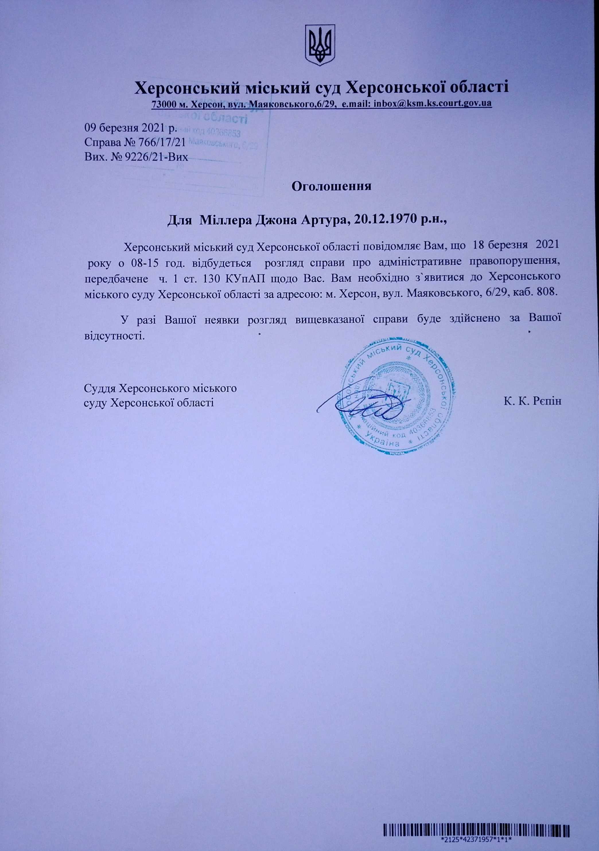 ОГОЛОШЕННЯ ПРО ВИКЛИК ДО СУДУ