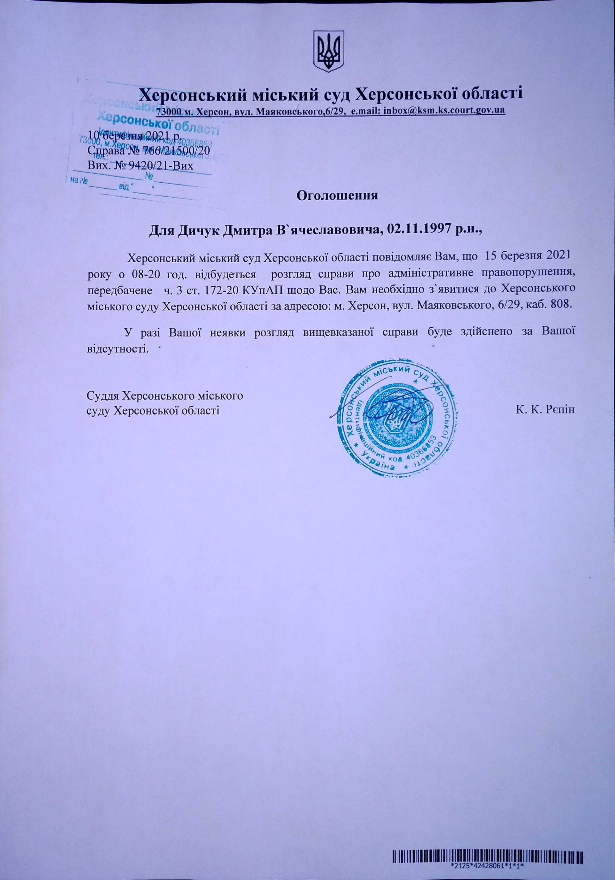 ОГОЛОШЕННЯ для Дичук Дмитра В`ячеславовича