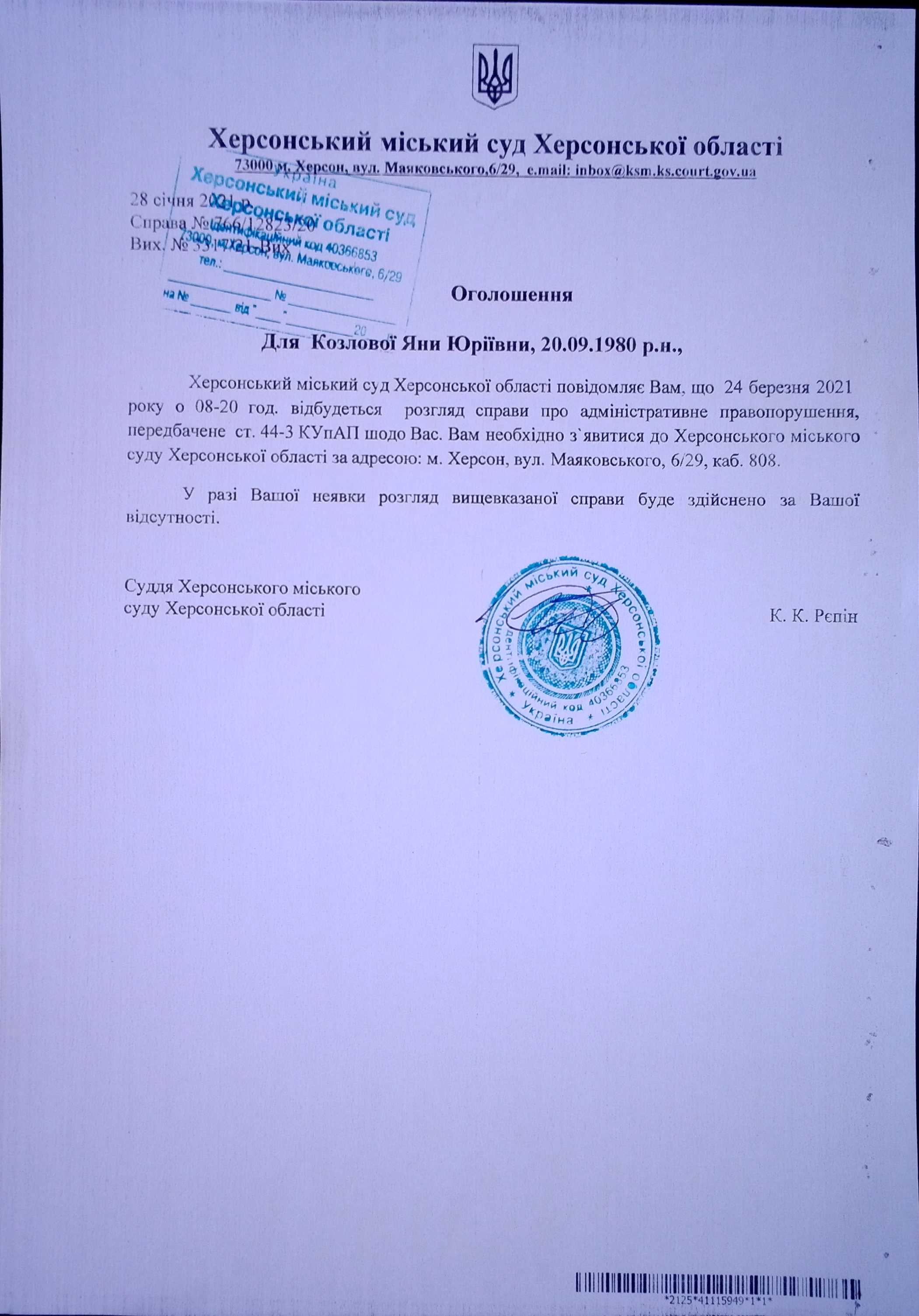 ОГОЛОШЕННЯ для Козлової Яни Юріївни