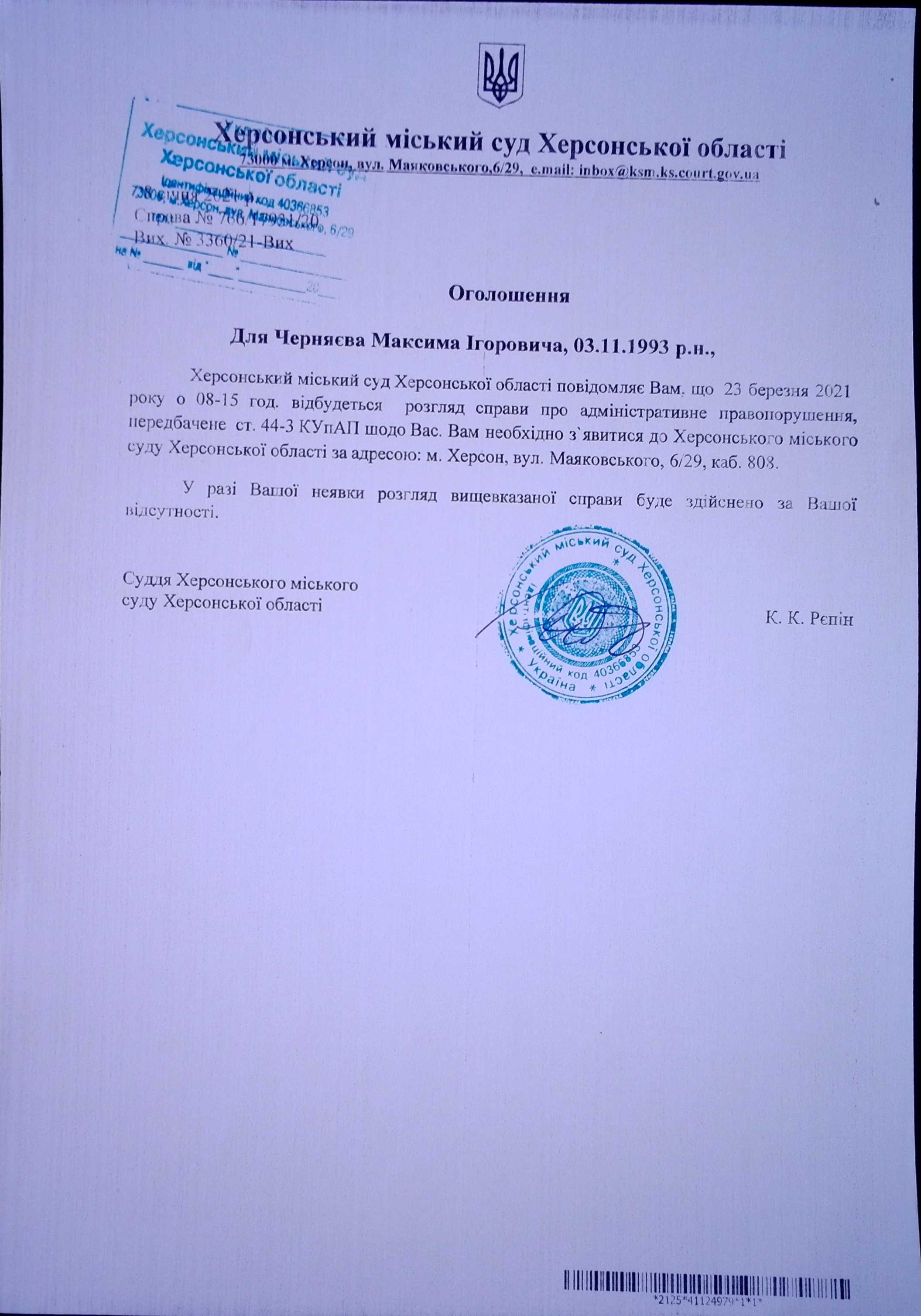ОГОЛОШЕННЯ для Черняєва Максима Ігоровича