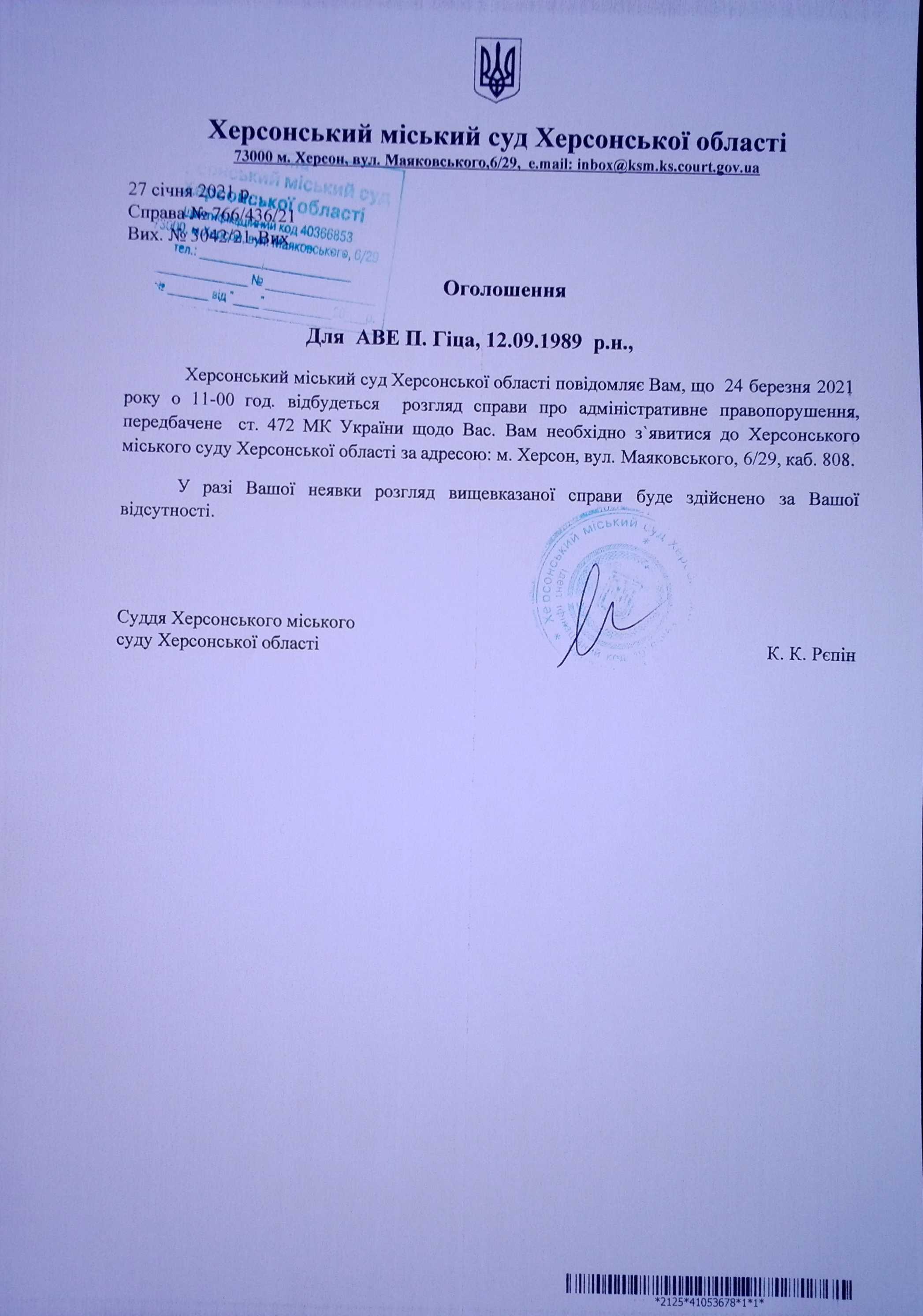 ОГОЛОШЕННЯ ПРО ВИКЛИК ДО СУДУ
