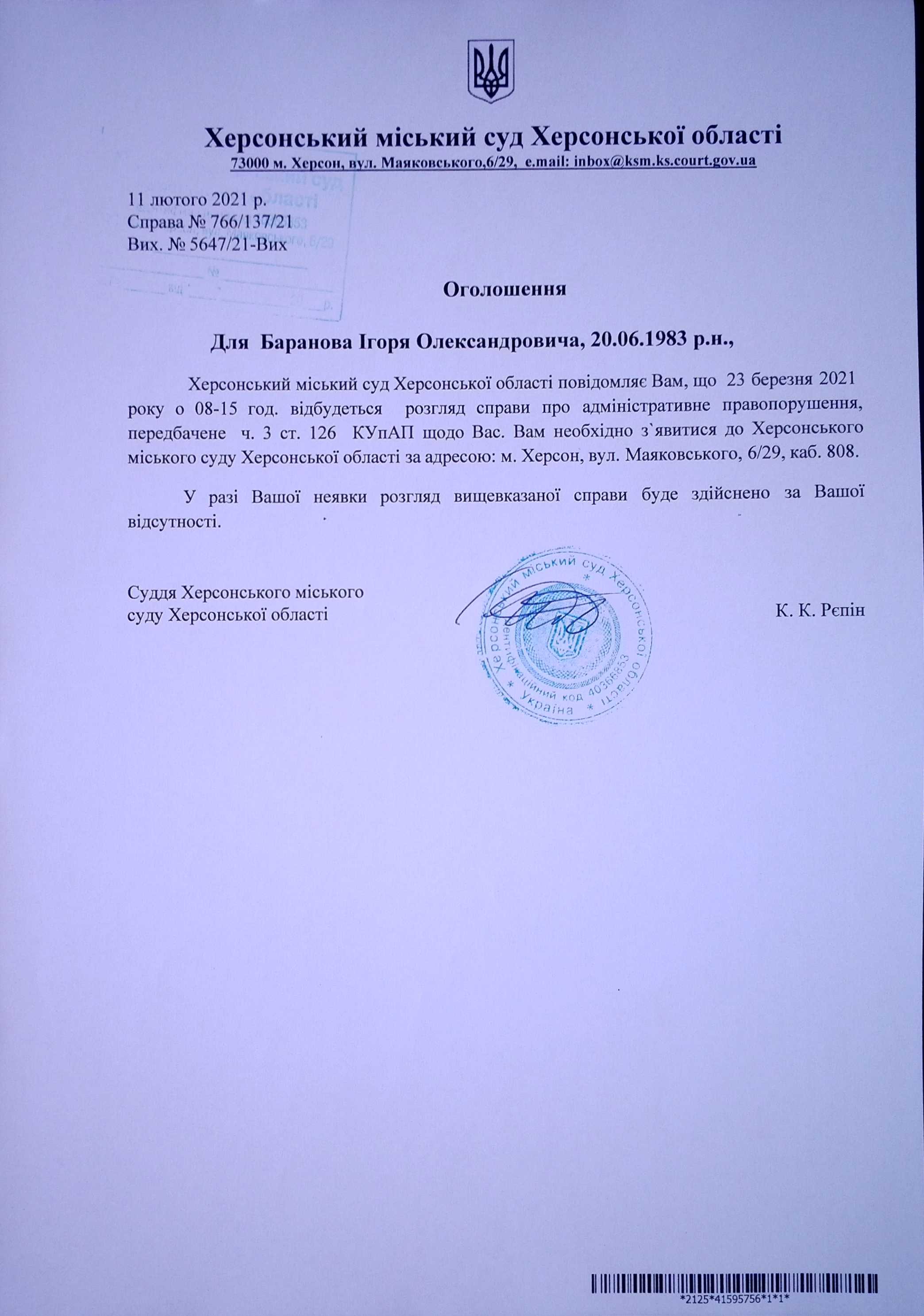 ОГОЛОШЕННЯ для Баранова Ігоря Олександровича