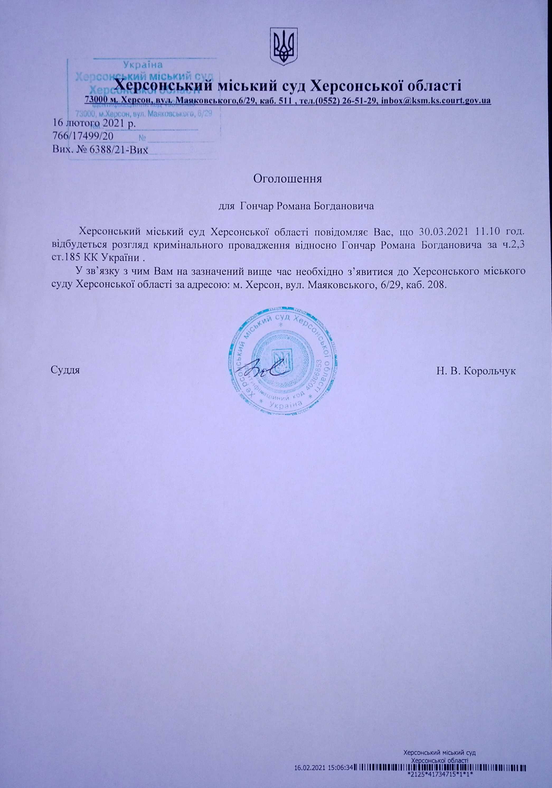 ОГОЛОШЕННЯ для Гончар Романа Богдановича