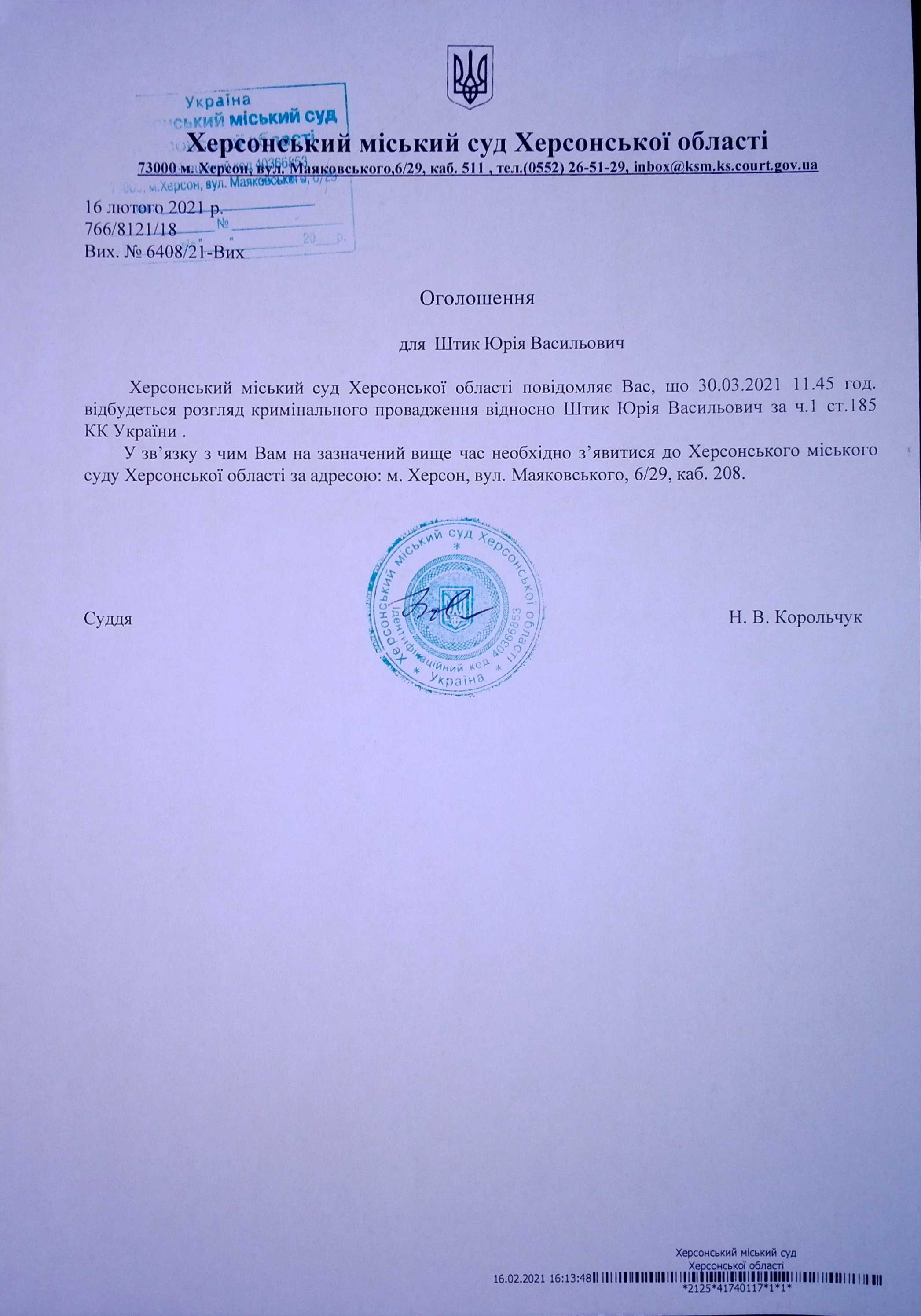 ОГОЛОШЕННЯ для Штик Юрія Васильовича