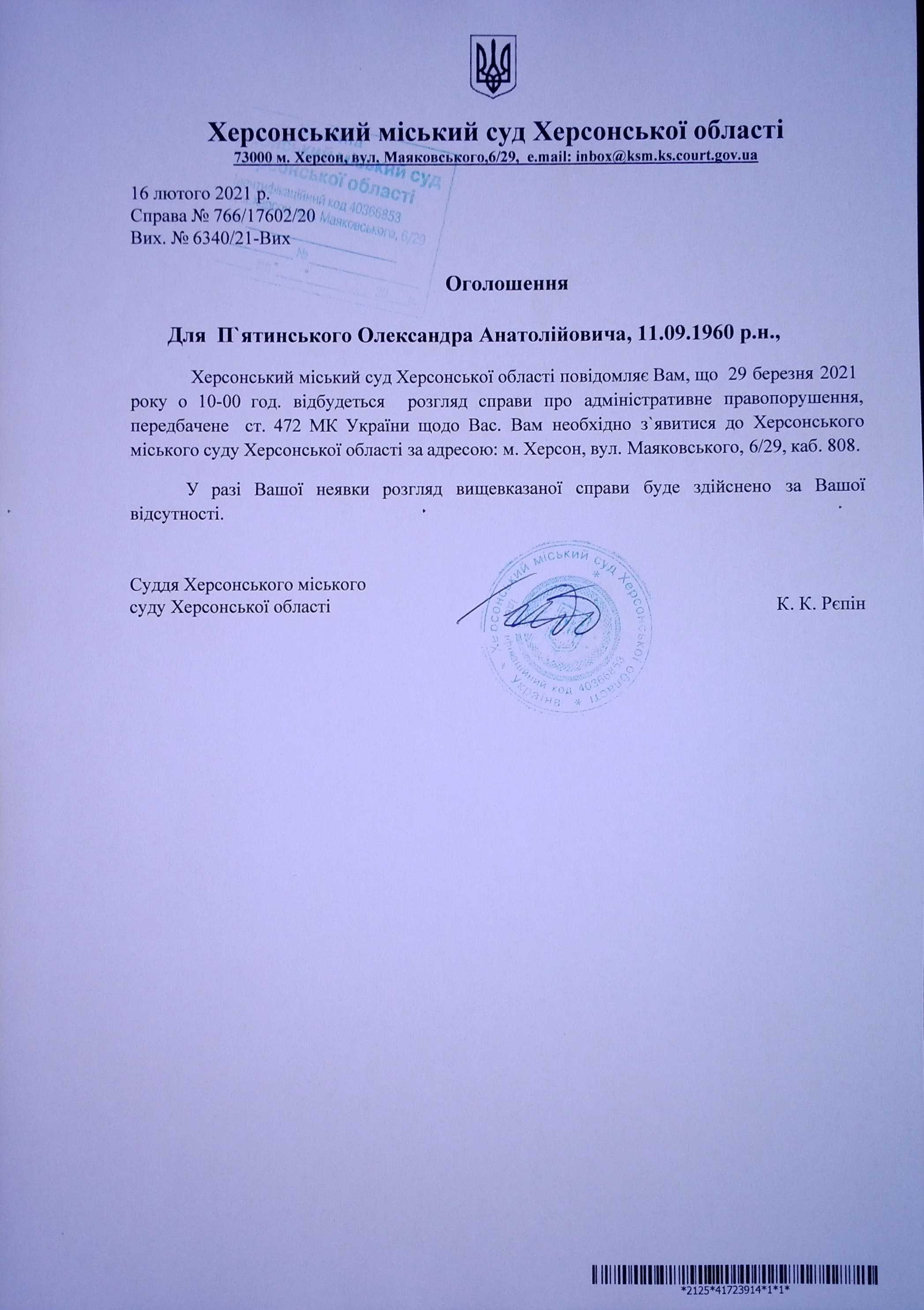 ОГОЛОШЕННЯ для П'ятинського Олександра Анатолійовича