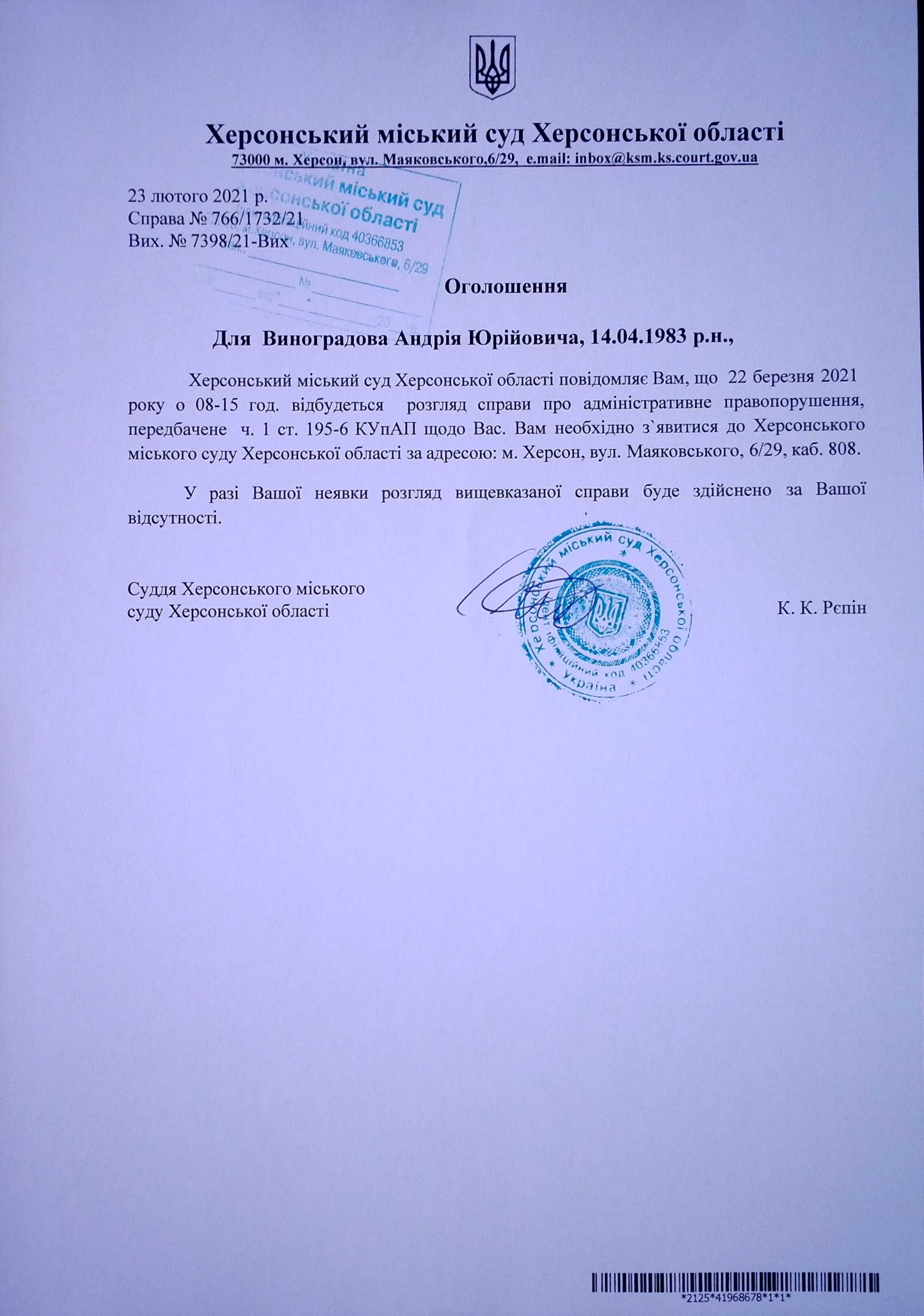 ОГОЛОШЕННЯ для Виноградова Андрія Юрійовича