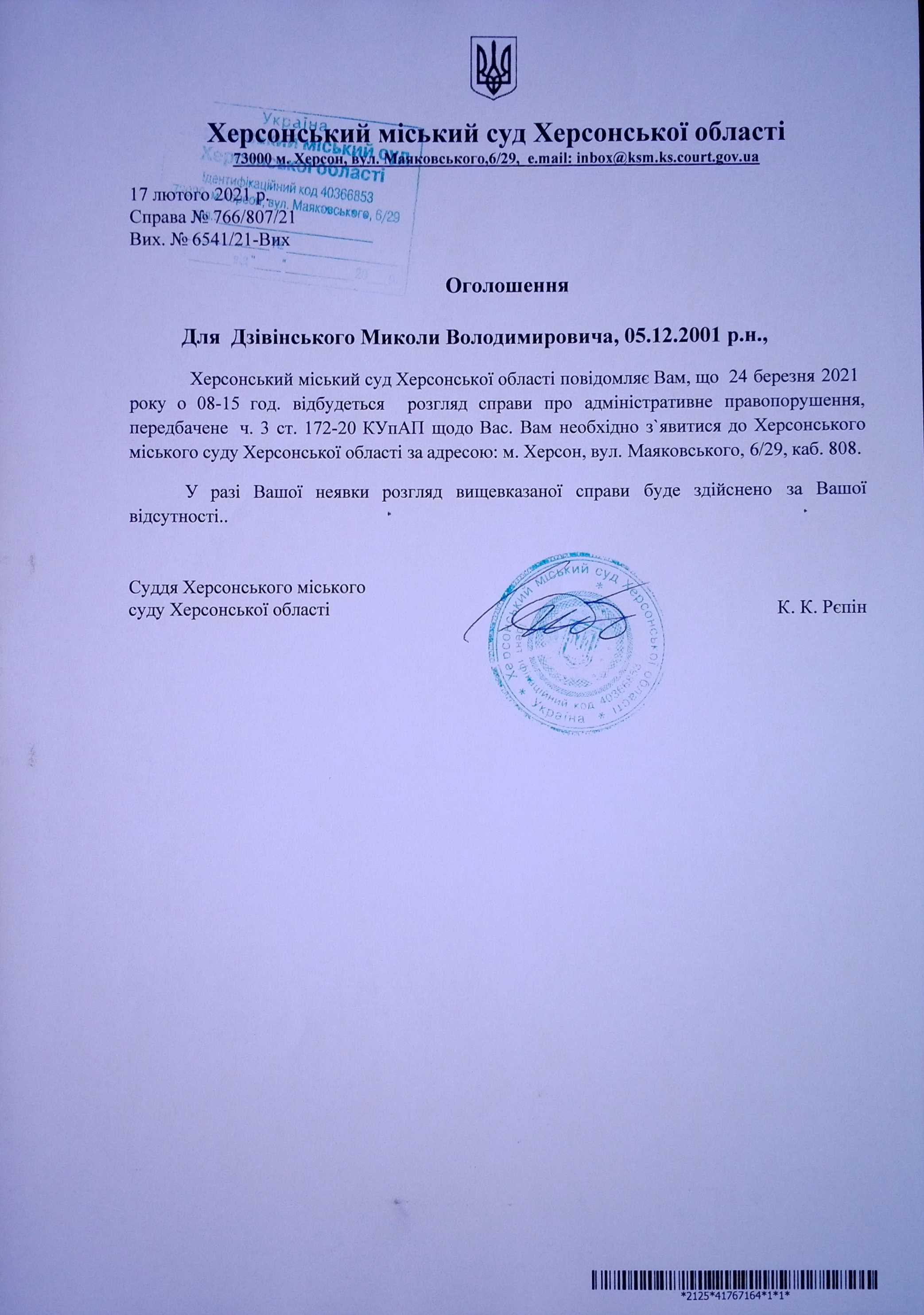 ОГОЛОШЕННЯ для Дзівінського Миколи Володимировича