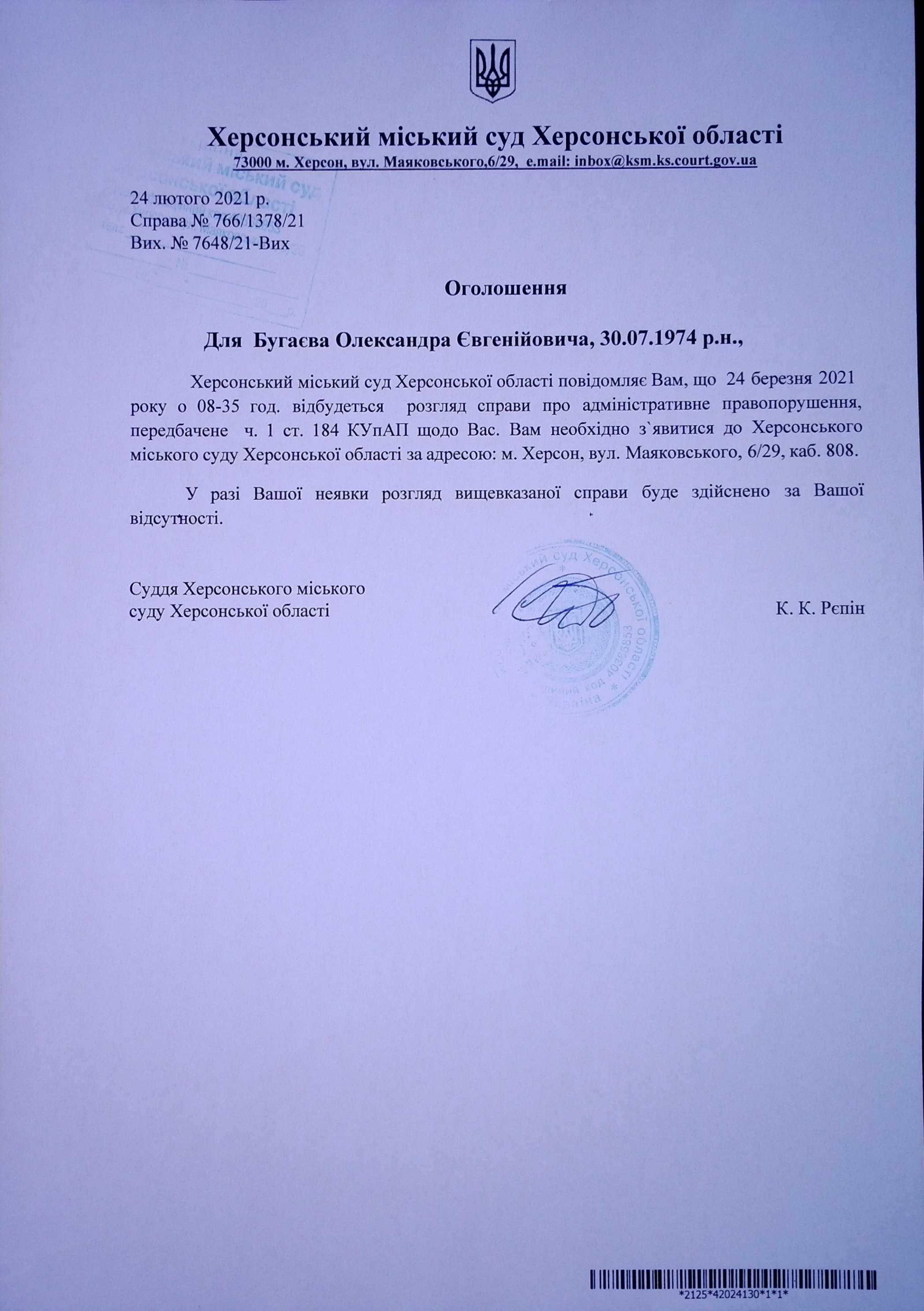 ОГОЛОШЕННЯ для Бугаєва Олександра Євгенійовича