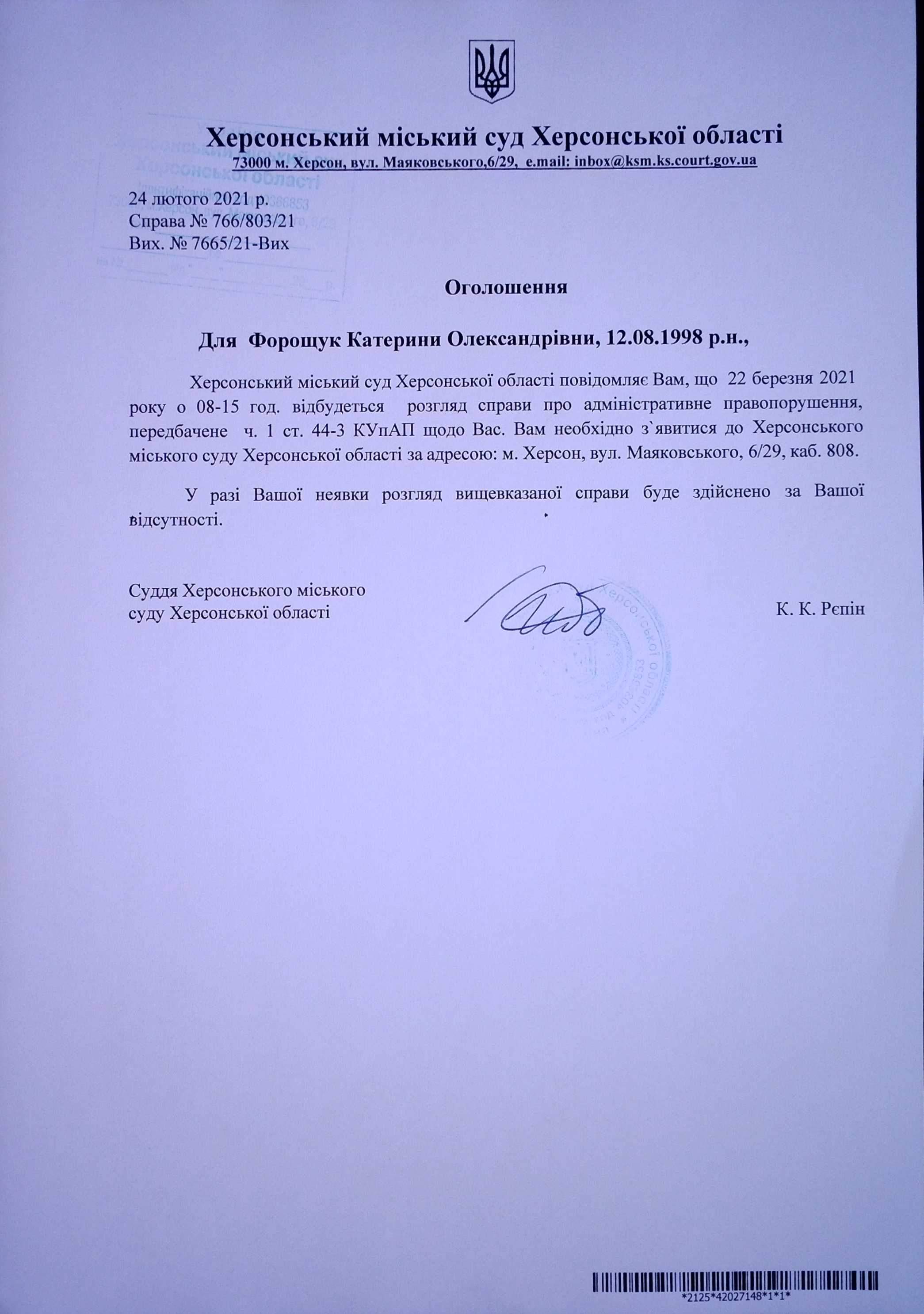 ОГОЛОШЕННЯ ПРО ВИКЛИК ДО СУДУ
