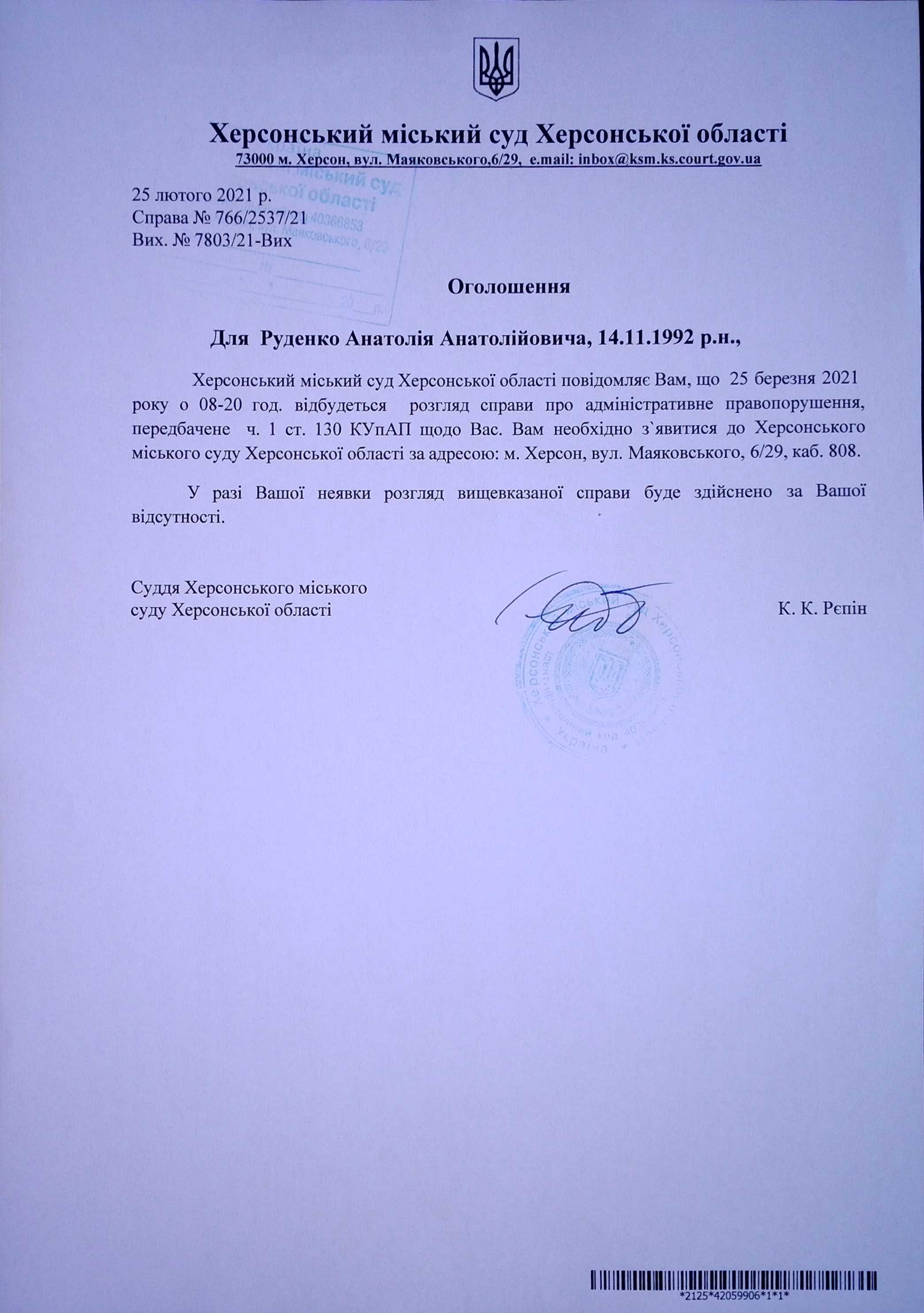 ОГОЛОШЕННЯ для Руденко Анатолія Анатолійовича