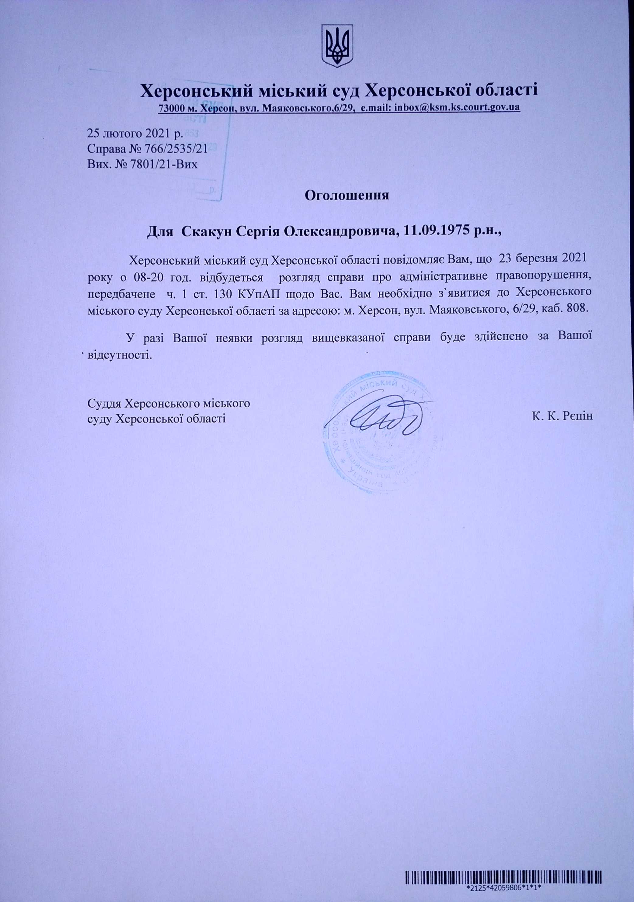 ОГОЛОШЕННЯ для Скакун Сергія Олександровича