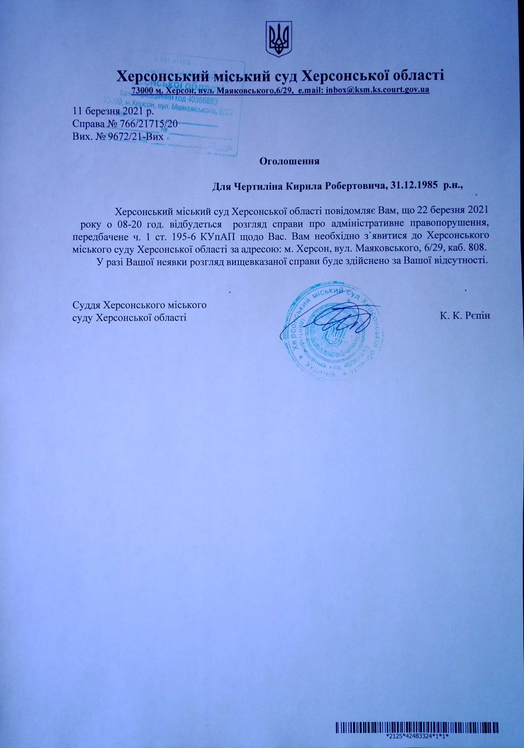 ОГОЛОШЕННЯ для Чертиліна Кирила Робертовича