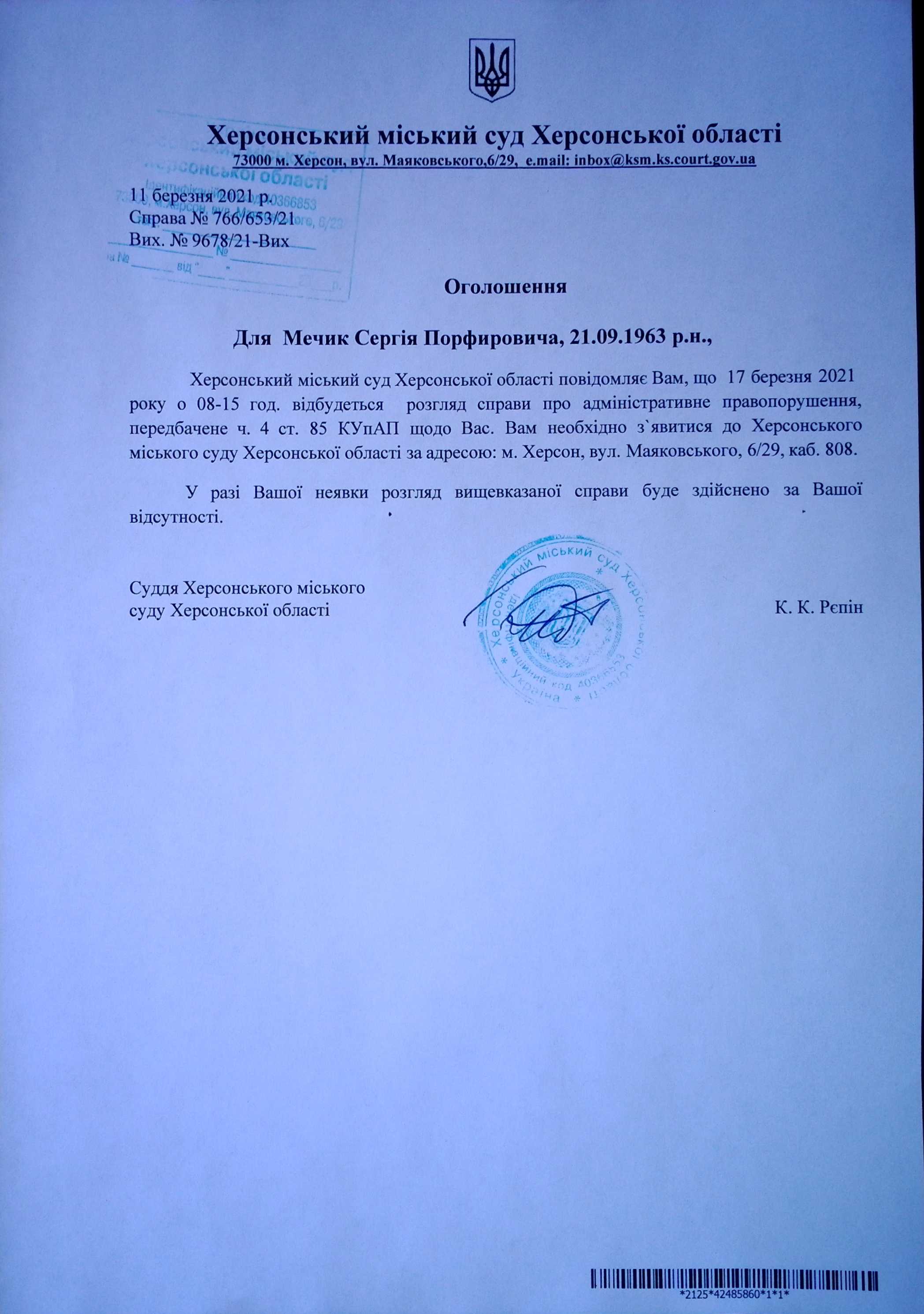 ОГОЛОШЕННЯ для Мечик Сергія Порфировича