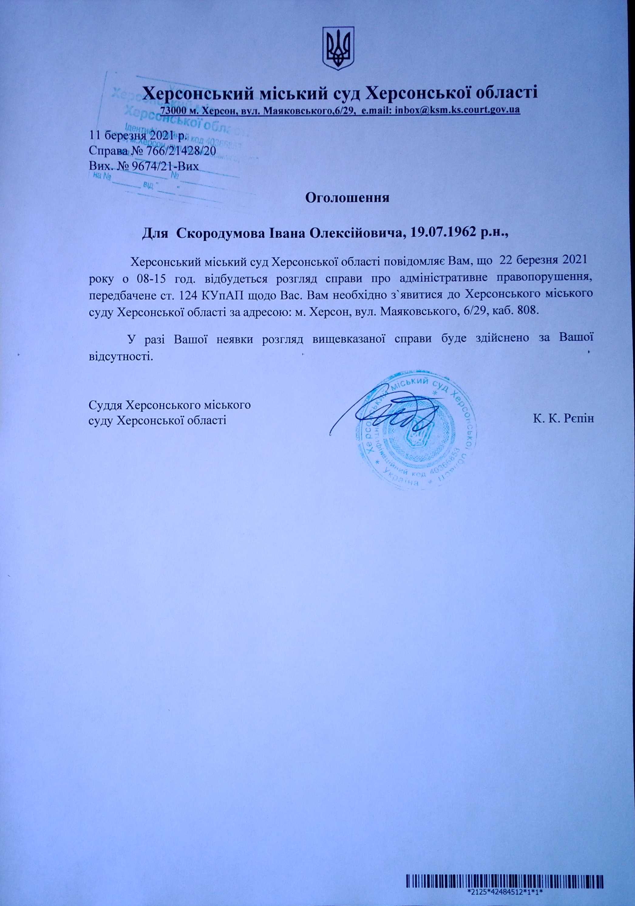 ОГОЛОШЕННЯ для Скородумова Івана Олексійовича