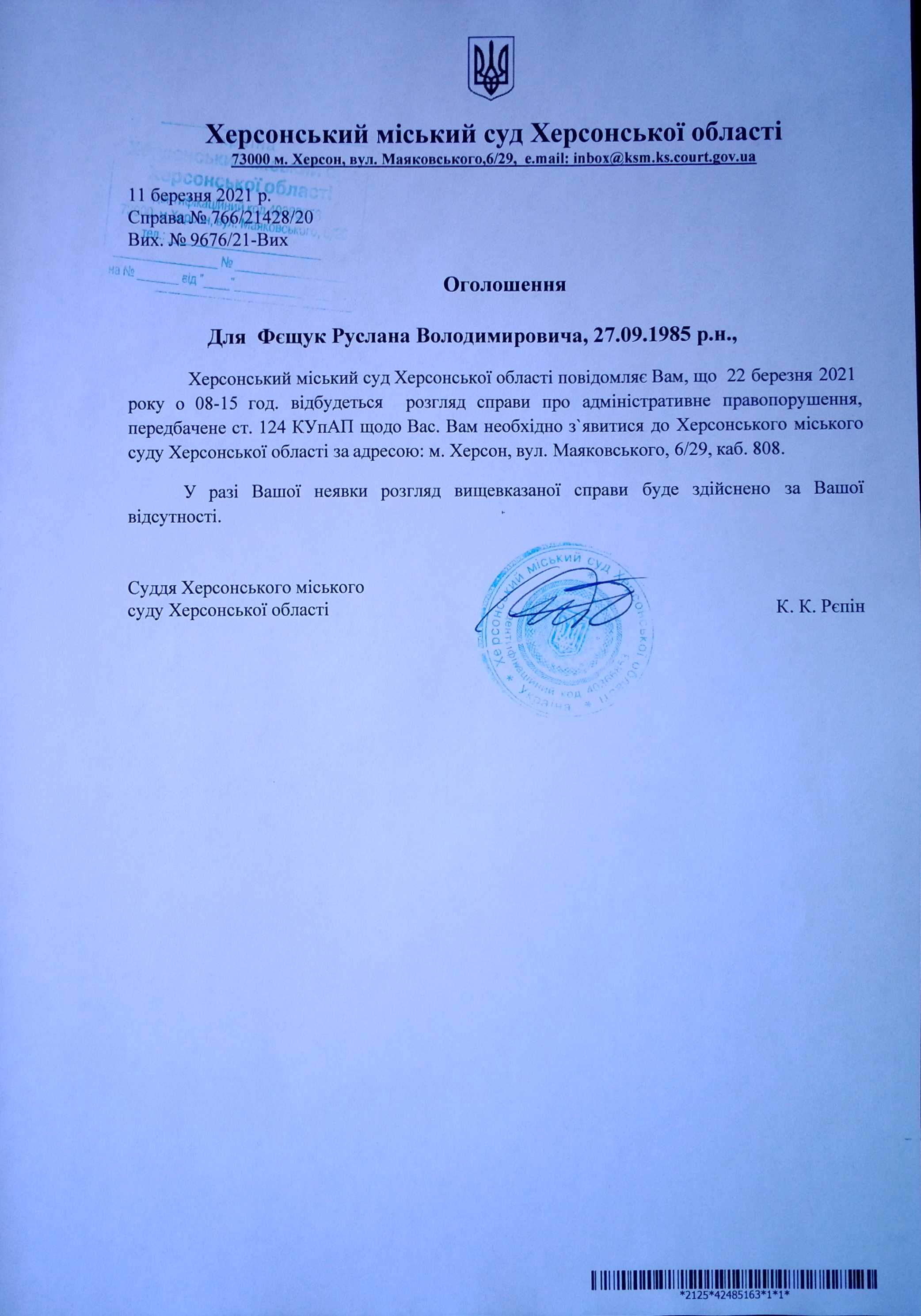 ОГОЛОШЕННЯ для Фєщук Руслана Володимировича