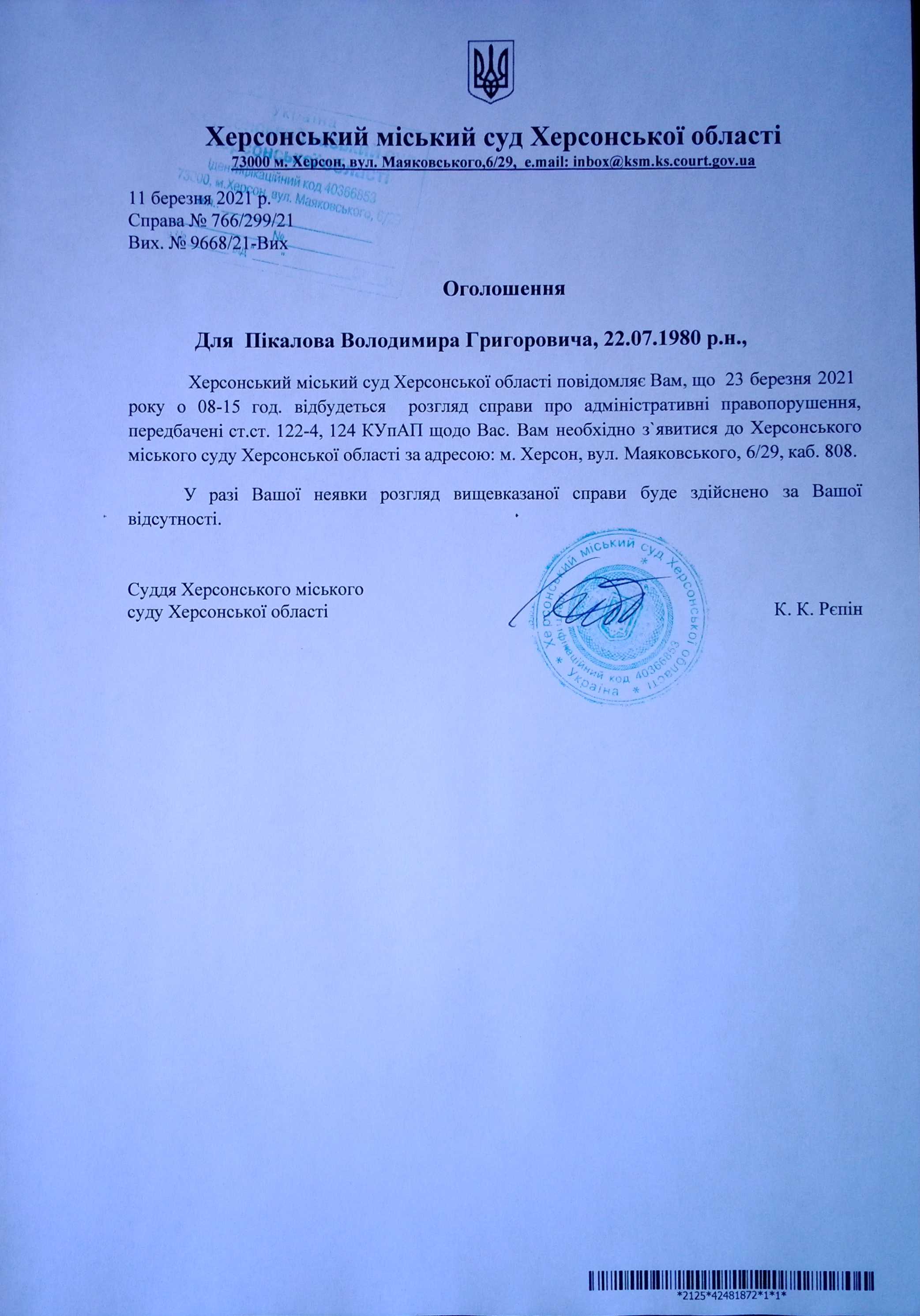 ОГОЛОШЕННЯ ПРО ВИКЛИК ДО СУДУ