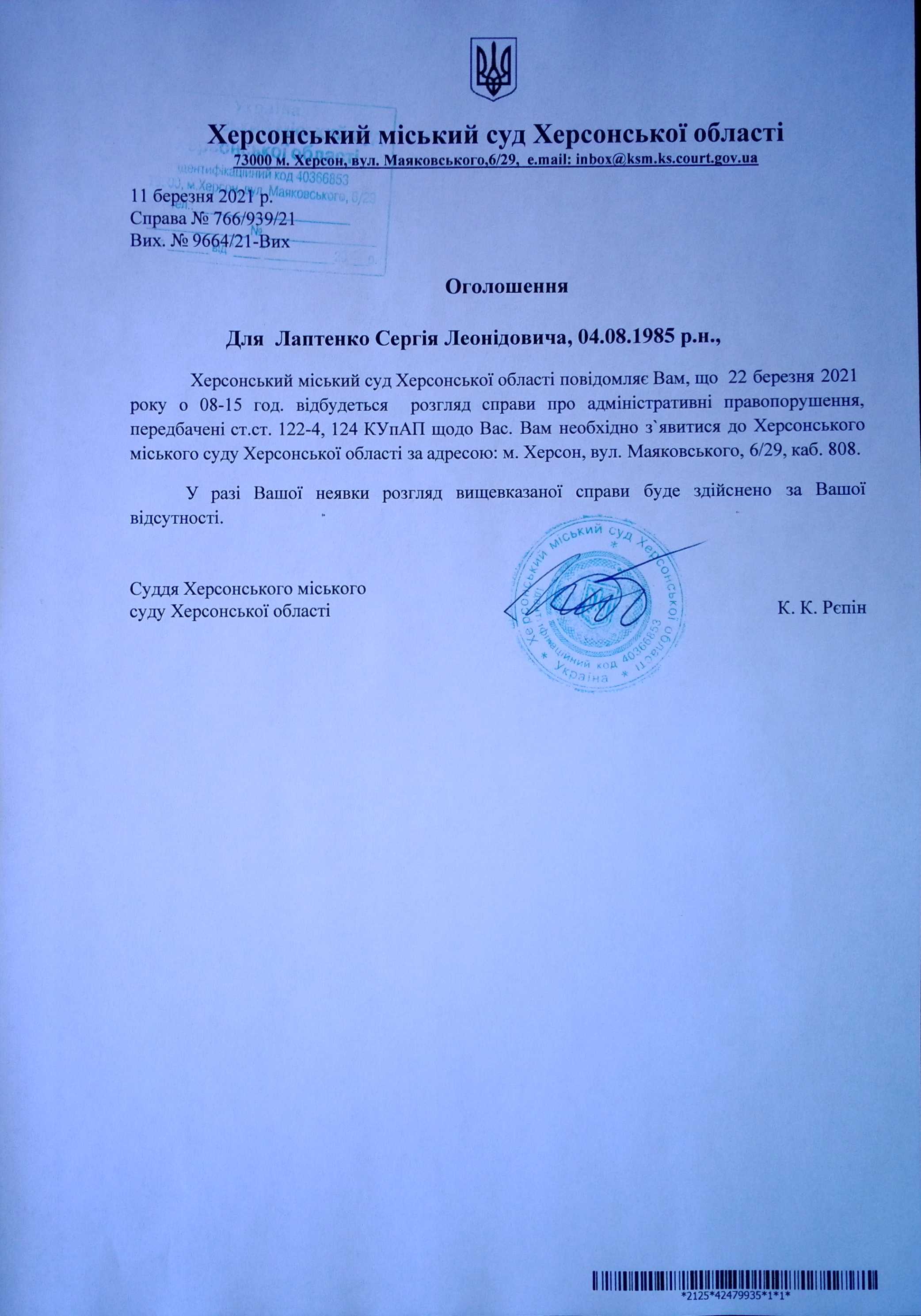 ОГОЛОШЕННЯ для Лаптенко Сергія Леонідовича