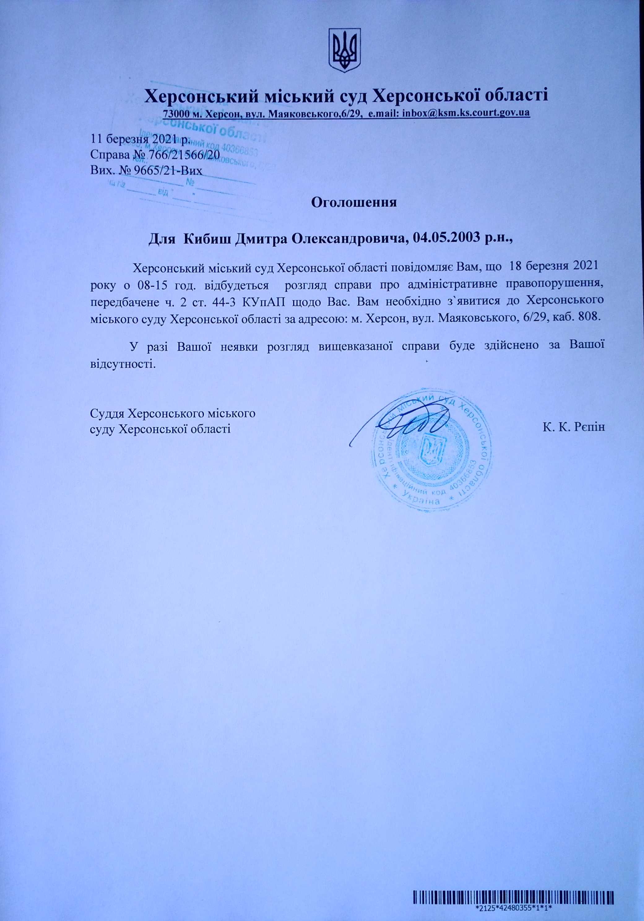 ОГОЛОШЕННЯ для Кибиш Дмитра Олександровича
