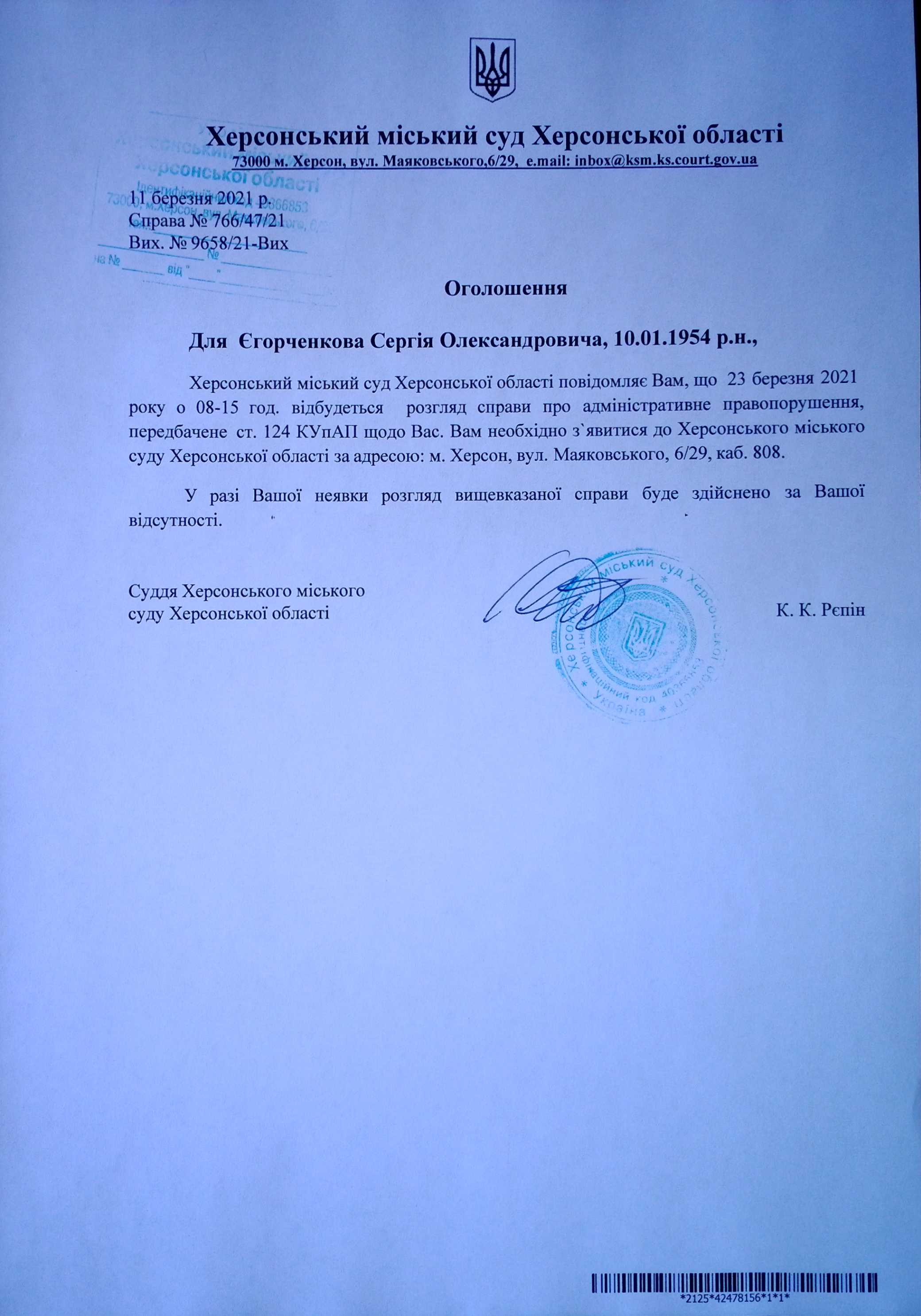 ОГОЛОШЕННЯ для Єгорченкова Сергія Олександровича