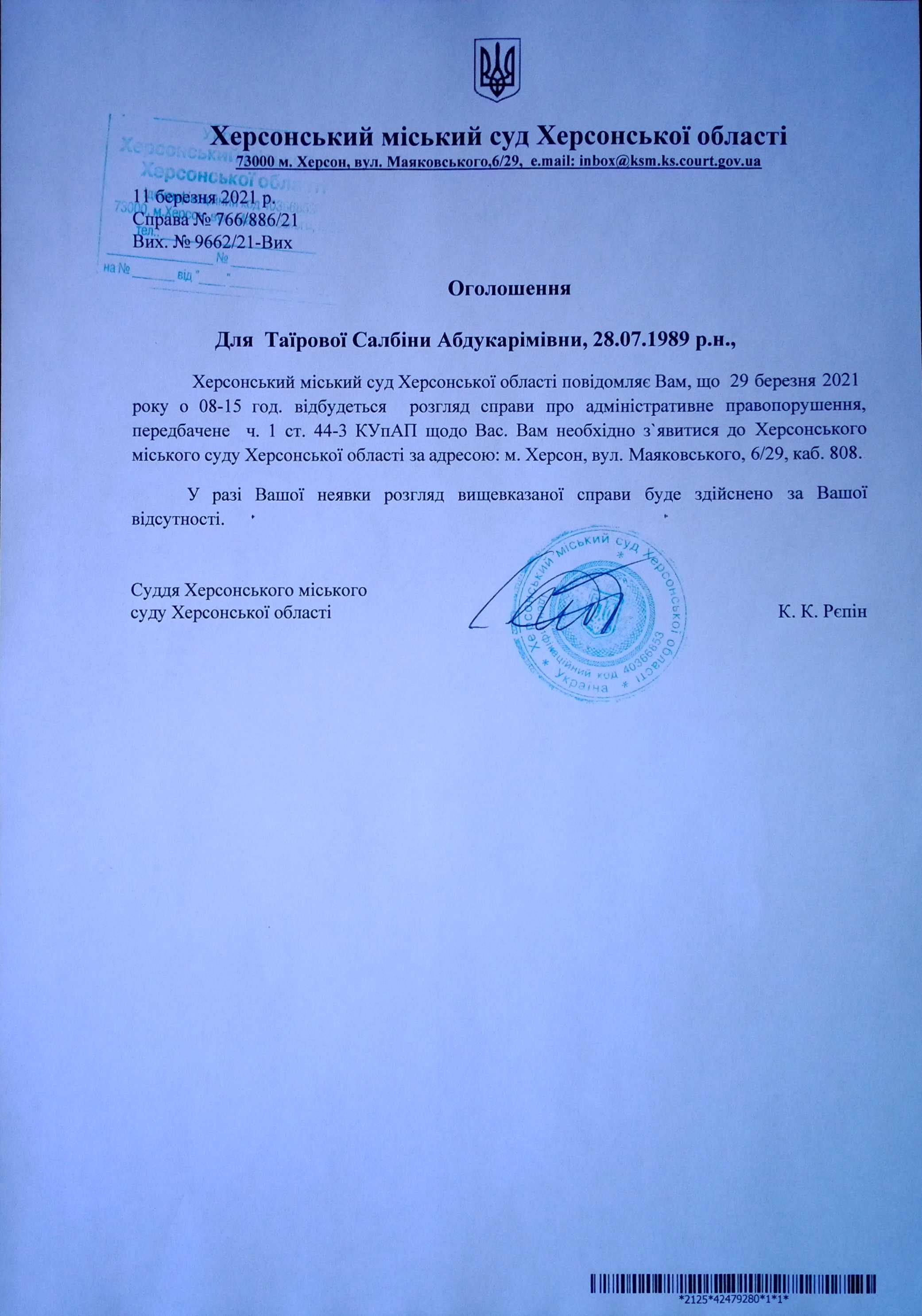 ОГОЛОШЕННЯ для Таїрової Салбіни Абдукарімівни