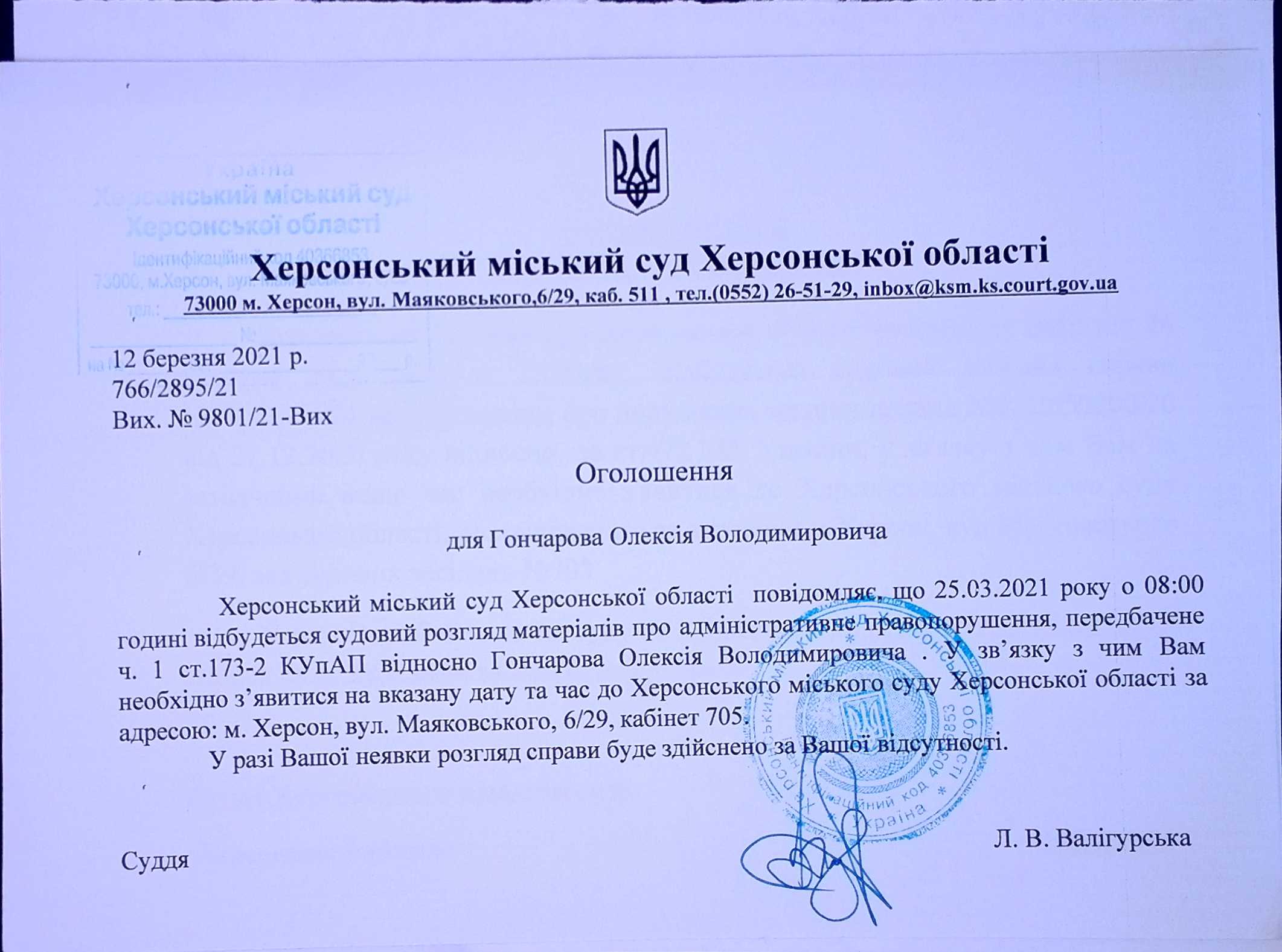 ОГОЛОШЕННЯ для Гончарова Олексія Володимировича