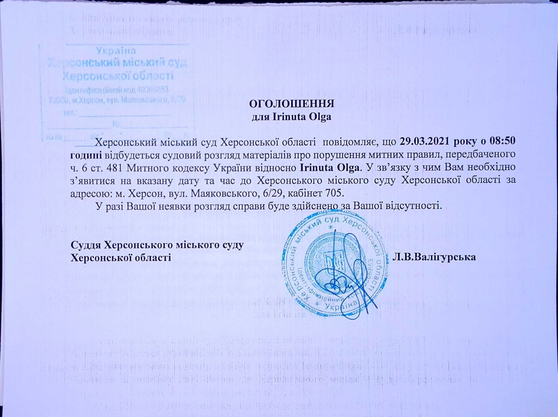 ОГОЛОШЕННЯ ПРО ВИКЛИК ДО СУДУ