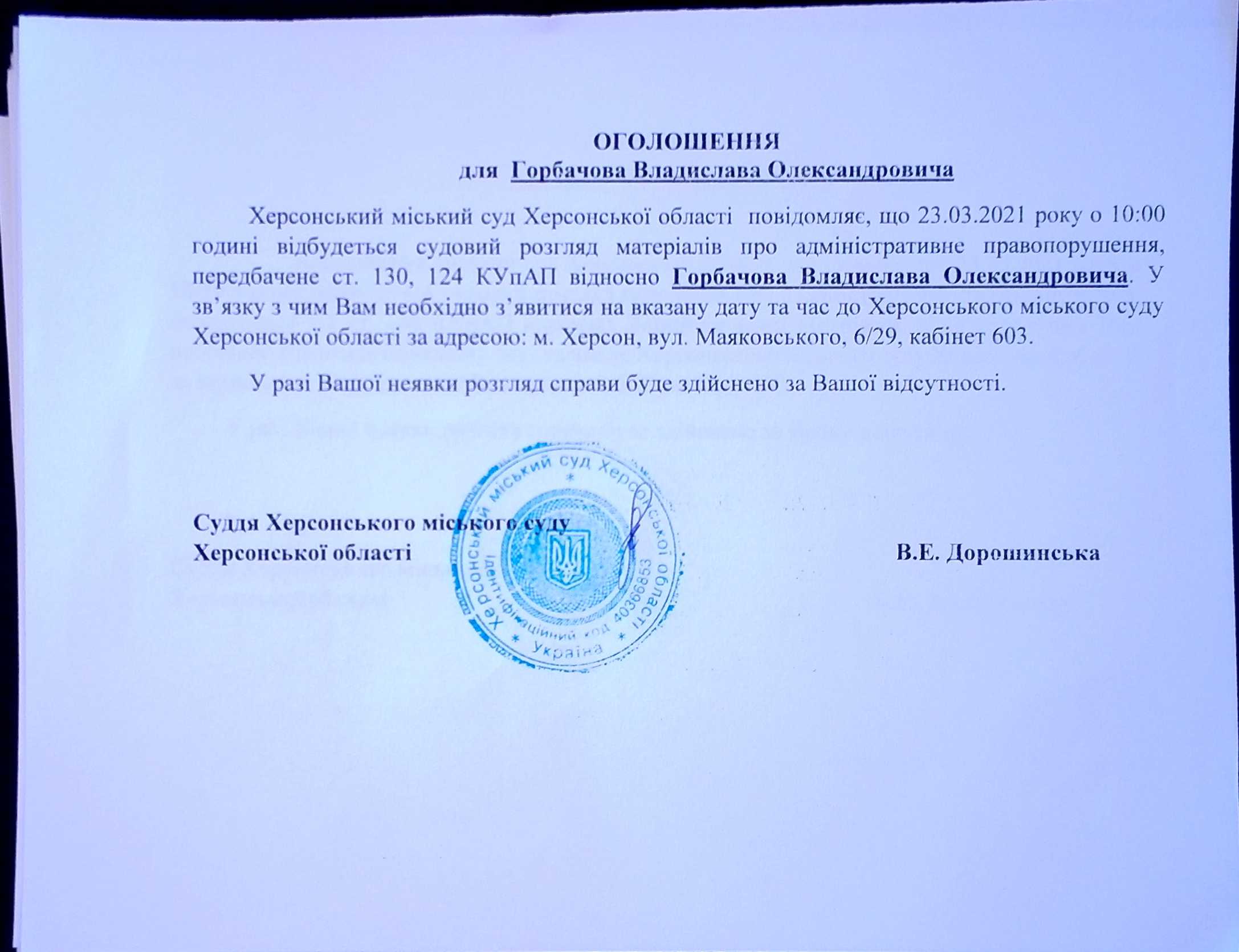 ОГОЛОШЕННЯ для Горбачова Владислава Олександровича