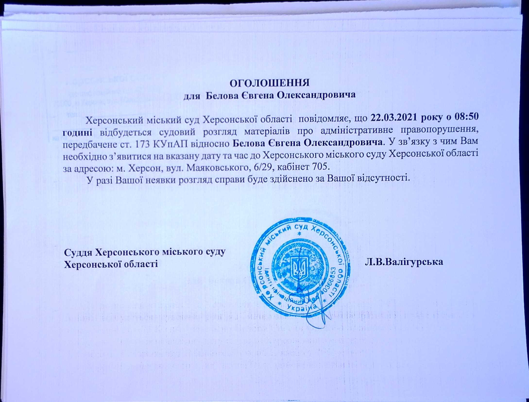 ОГОЛОШЕННЯ для Белова Євгена Олександровича