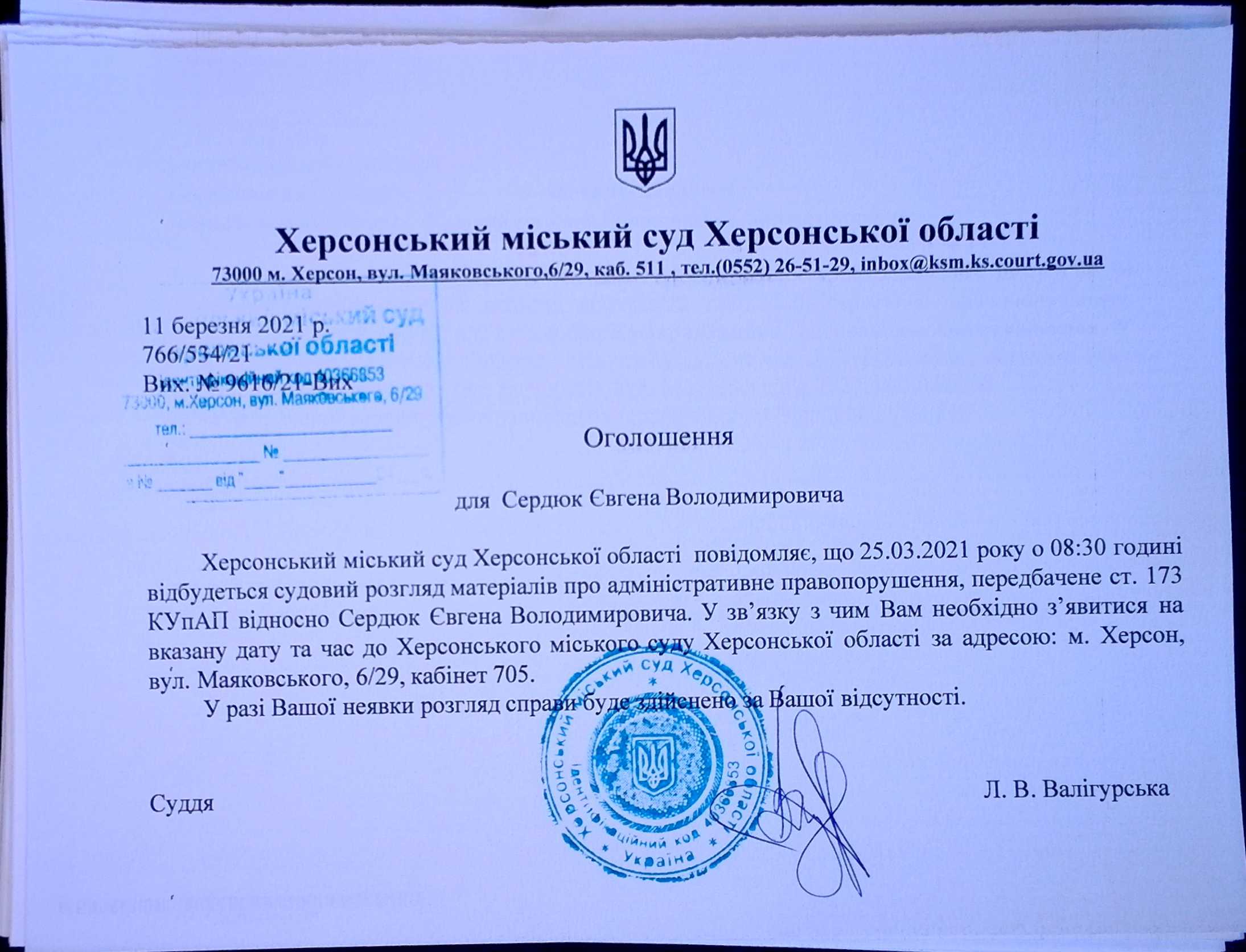 ОГОЛОШЕННЯ для Сердюк Євгена Володимировича