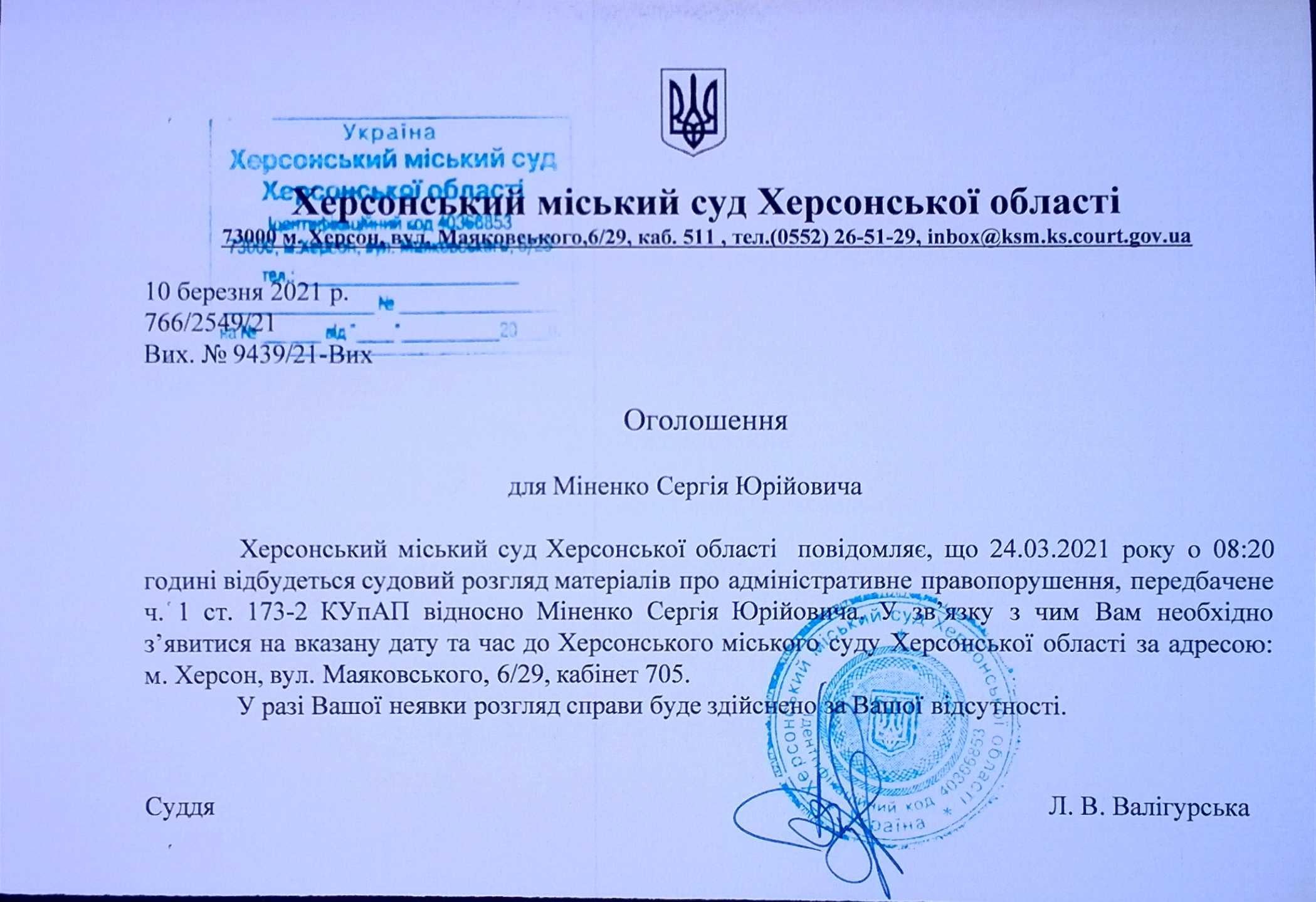 ОГОЛОШЕННЯ для Міненка Сергія Юрійовича