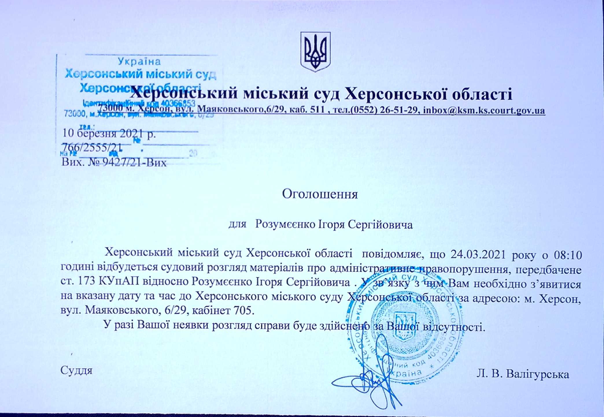 ОГОЛОШЕННЯ для Розумєєнко Ігоря Сергійовича