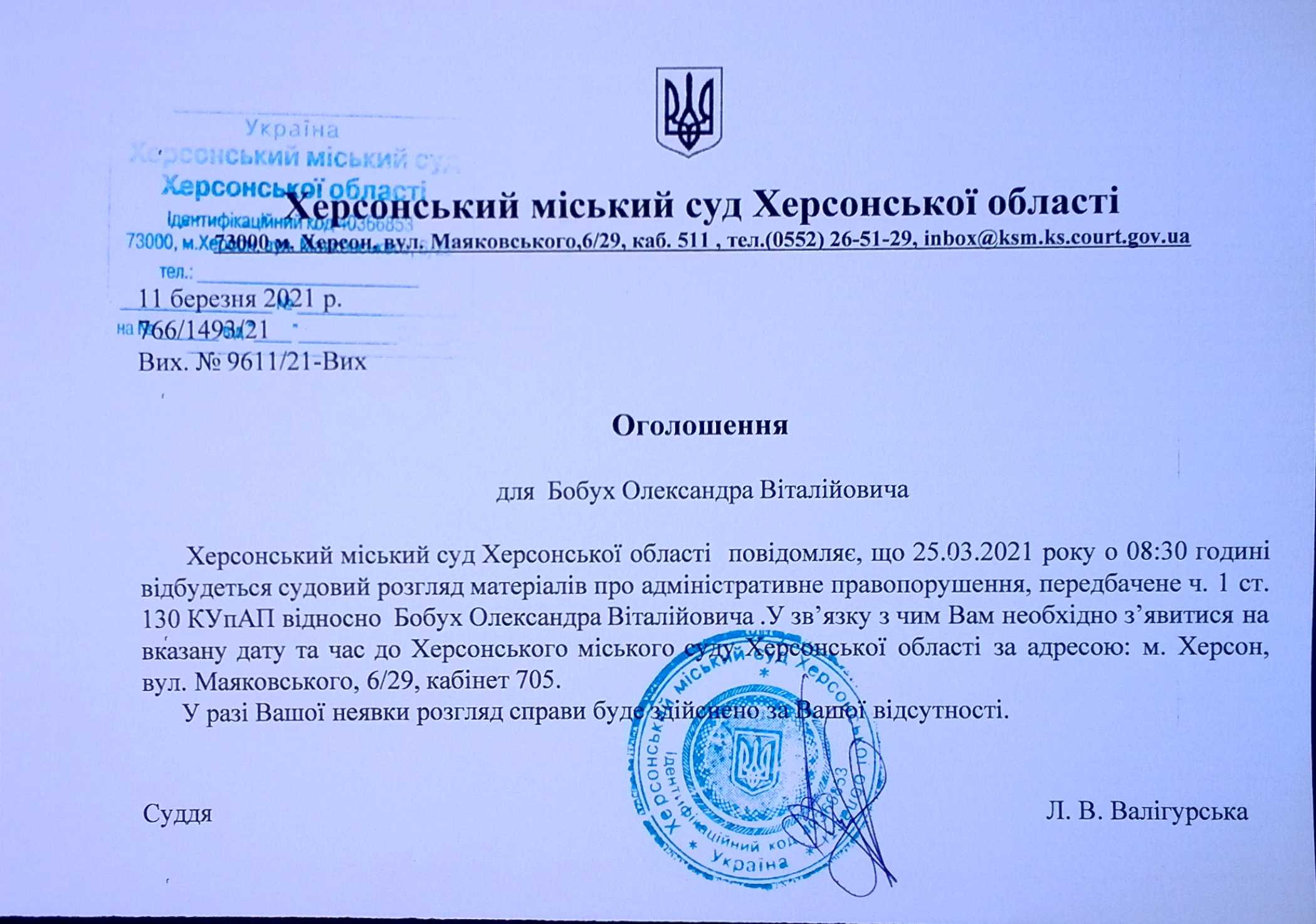 ОГОЛОШЕННЯ для Бобух Олександра Віталійовича