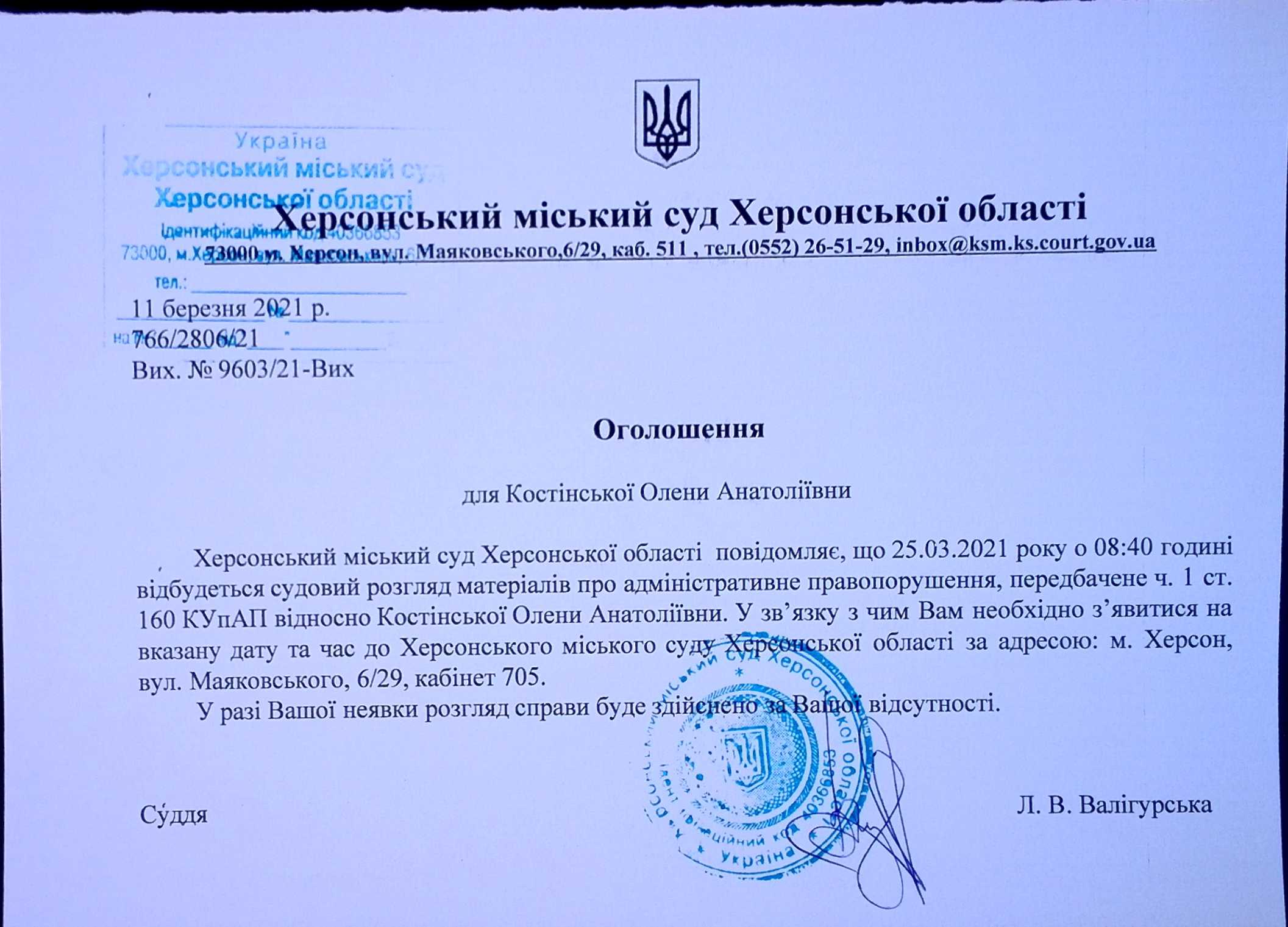 ОГОЛОШЕННЯ для Костінської Олени Анатоліївни