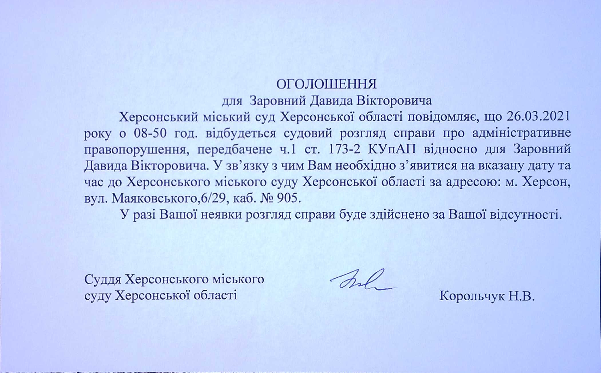ОГОЛОШЕННЯ ПРО ВИКЛИК ДО СУДУ
