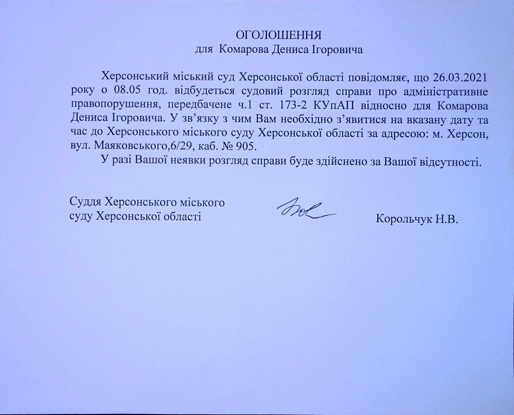 ОГОЛОШЕННЯ для Комарова Дениса Ігоровича