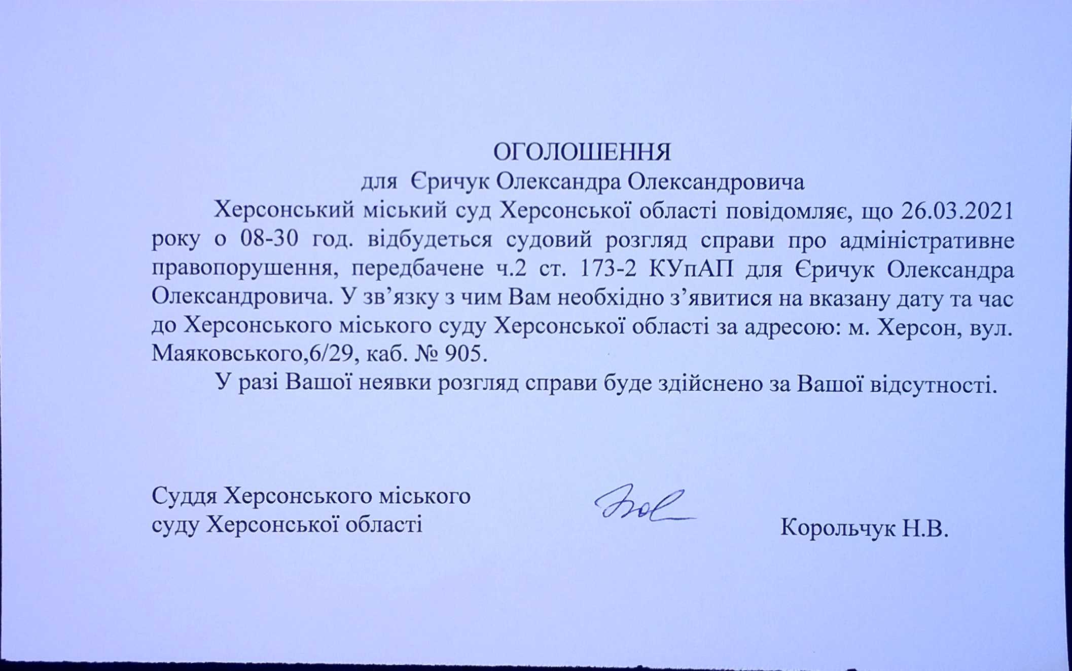 ОГОЛОШЕННЯ ПРО ВИКЛИК ДО СУДУ