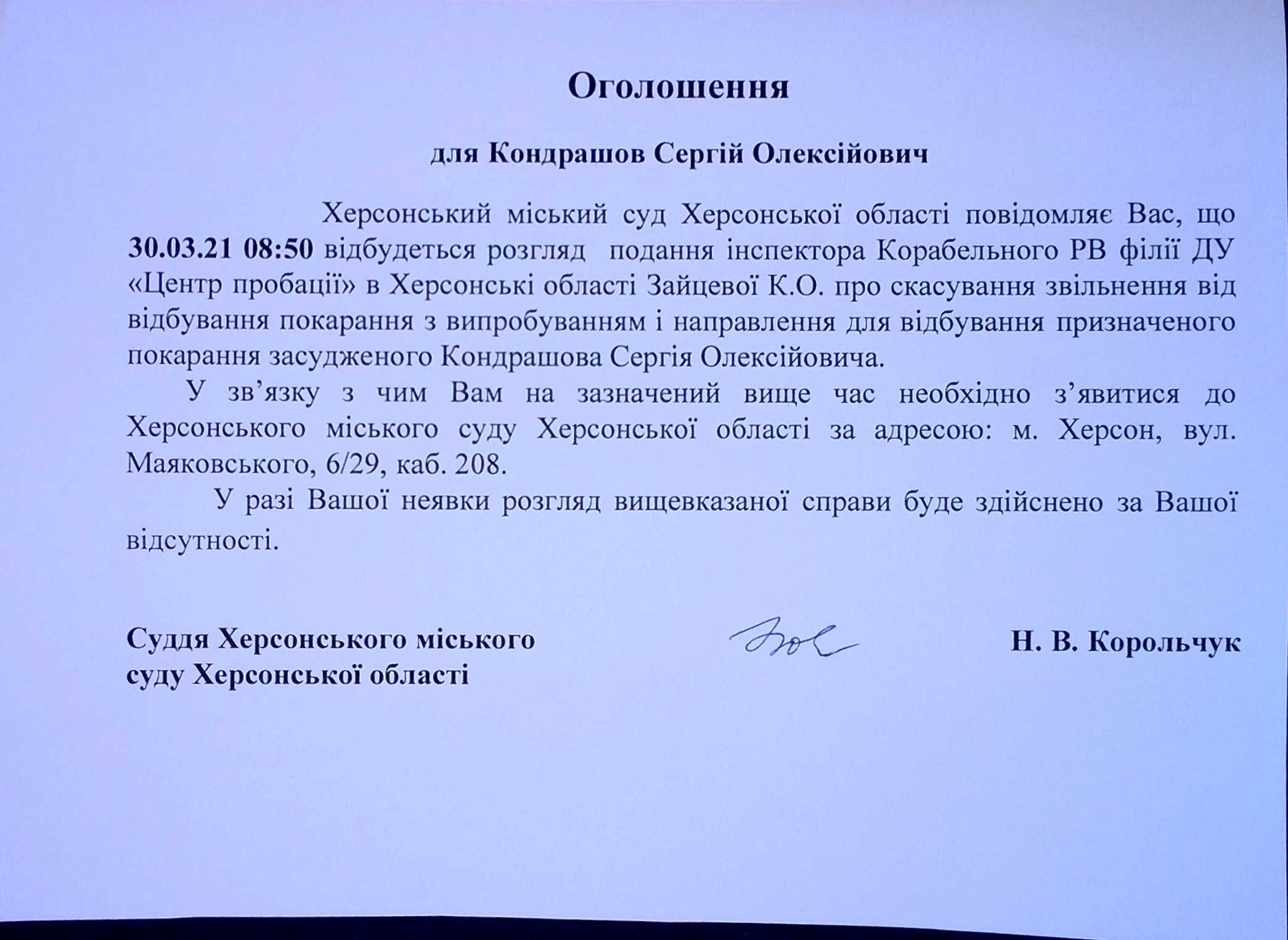 ОГОЛОШЕННЯ для Кондрашова Сергія Олексійовича