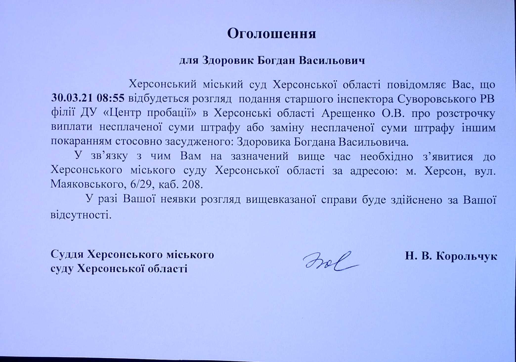 ОГОЛОШЕННЯ для Здоровика Богдана Васильовича