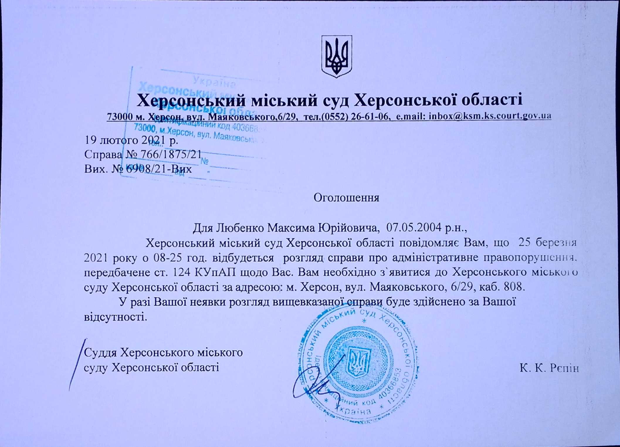 ОГОЛОШЕННЯ для Любенко Максима Юрійовича