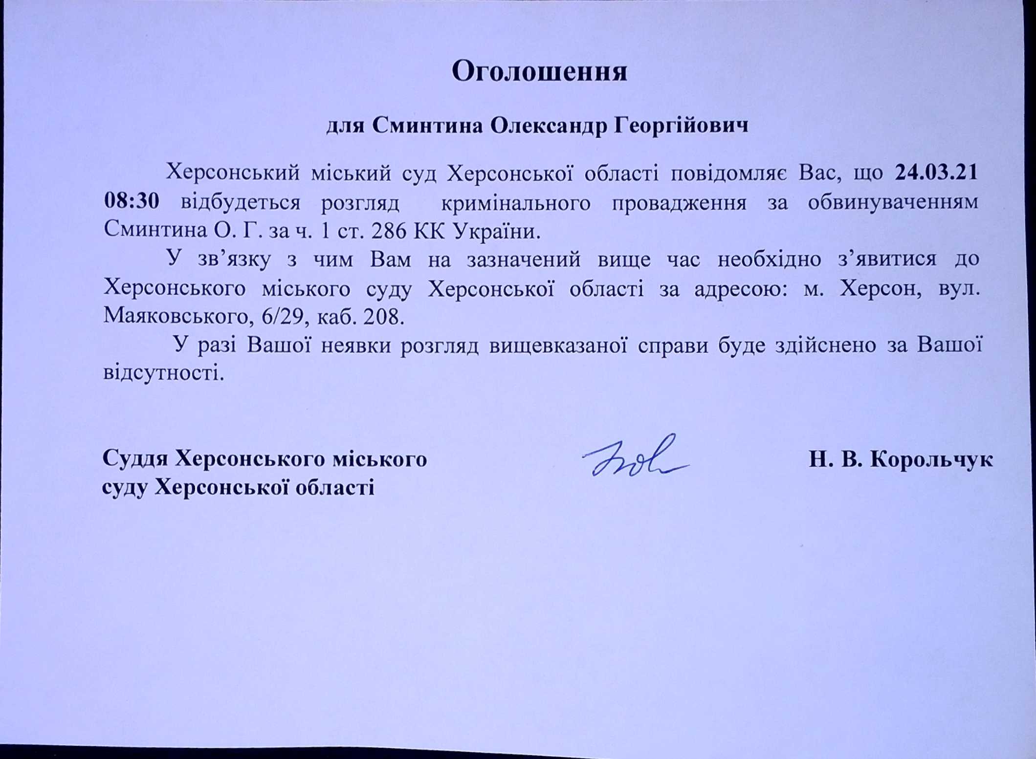 ОГОЛОШЕННЯ для Сминтина Олександра Георгійовича