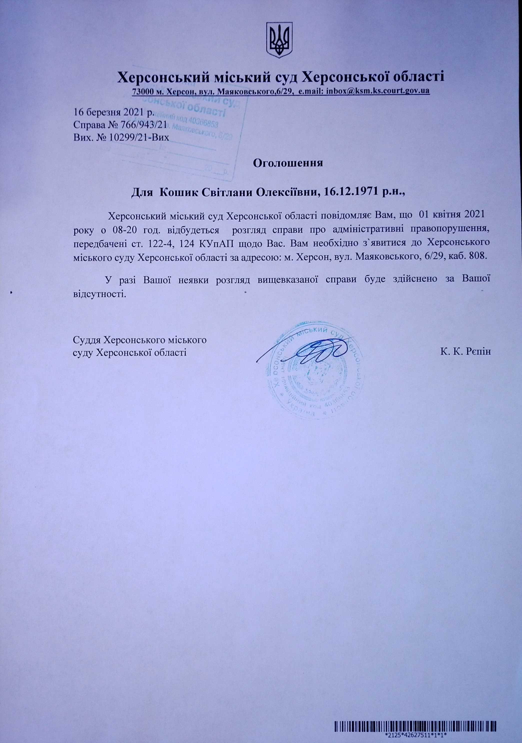 ОГОЛОШЕННЯ для Кошик Світлани Олексіївни