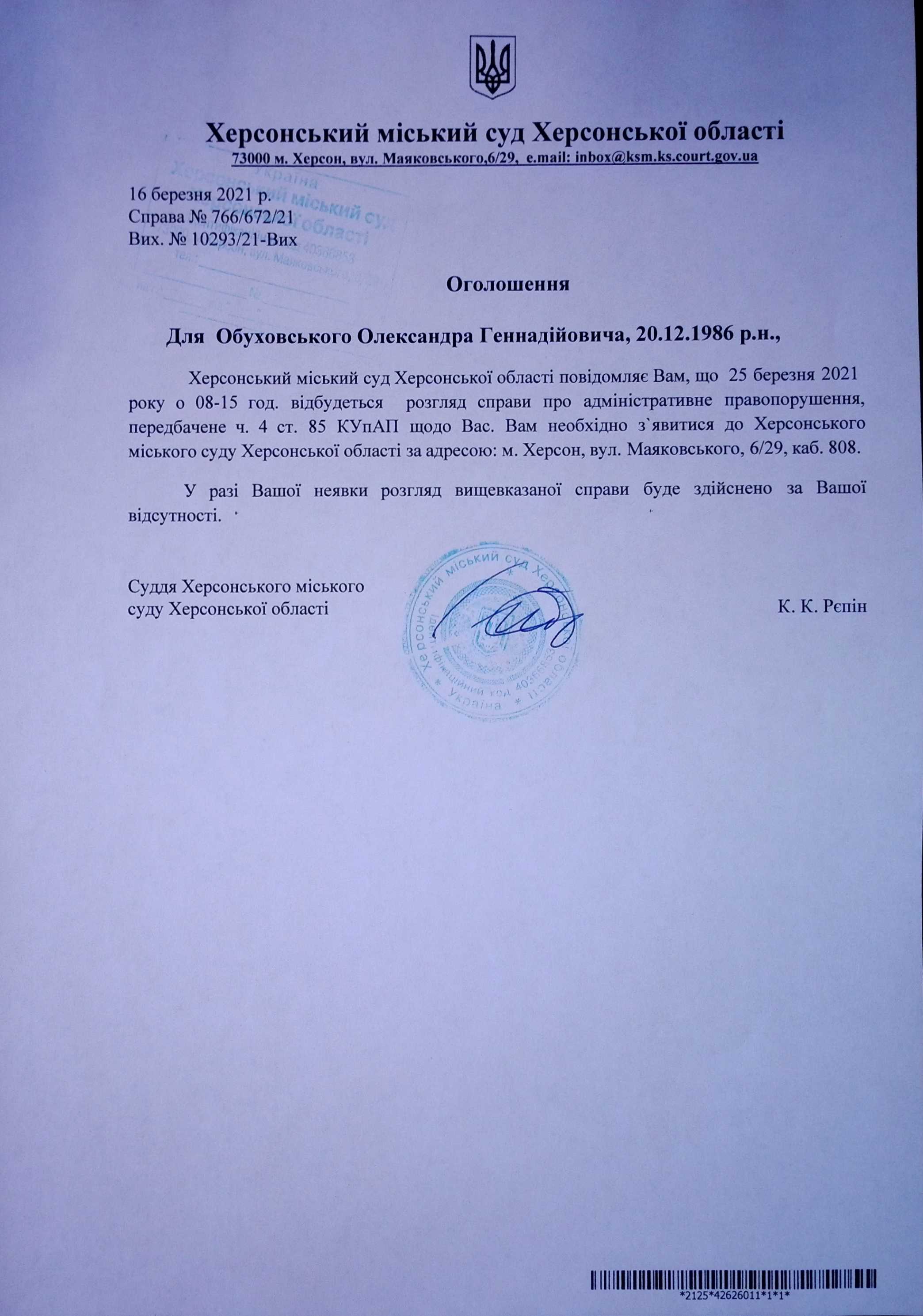 ОГОЛОШЕННЯ для Обуховського Олександра Геннадійовича