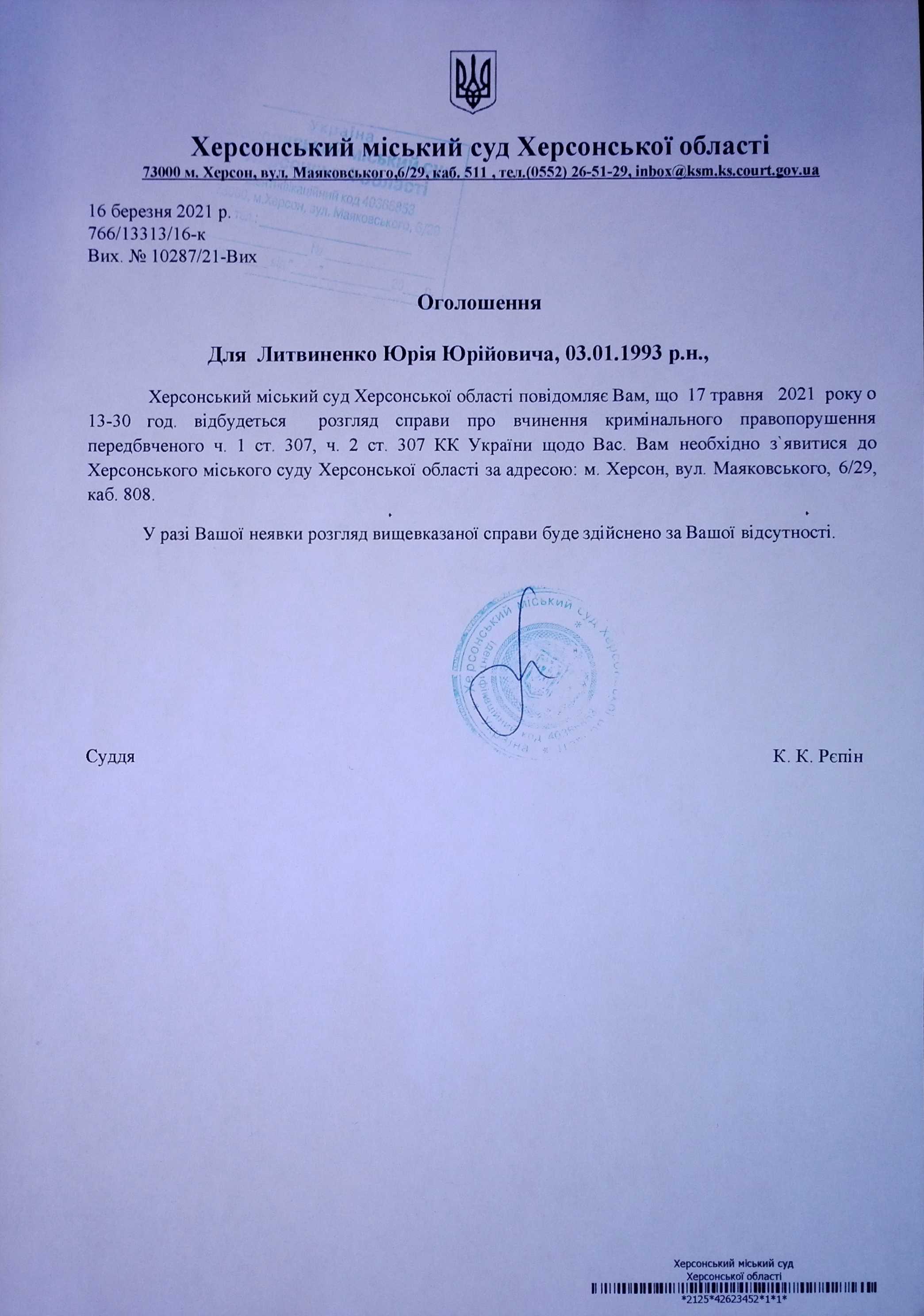 ОГОЛОШЕННЯ для Литвиненко Юрія Юрійовича