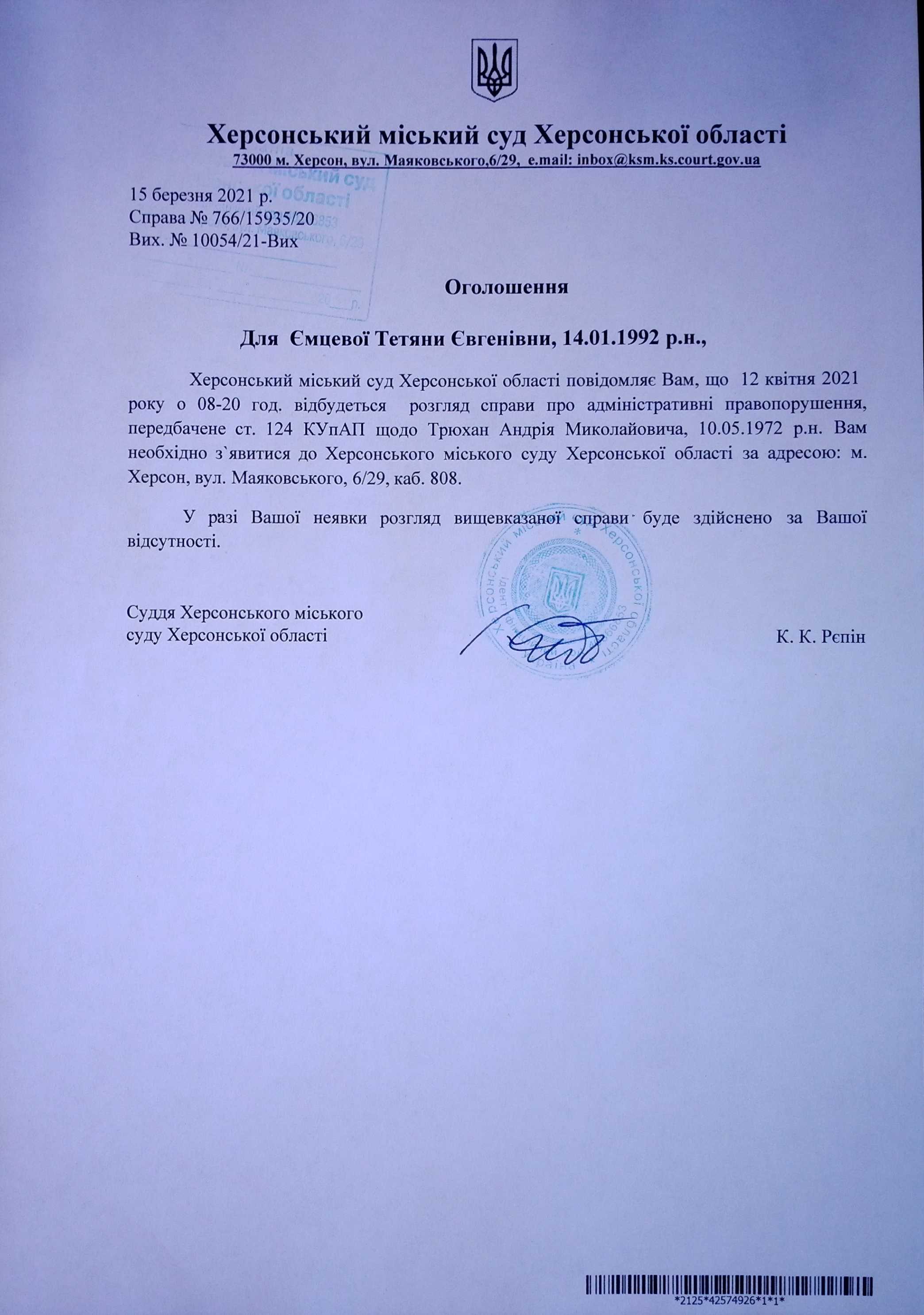 ОГОЛОШЕННЯ для Ємцевої Тетяни Євгенівни
