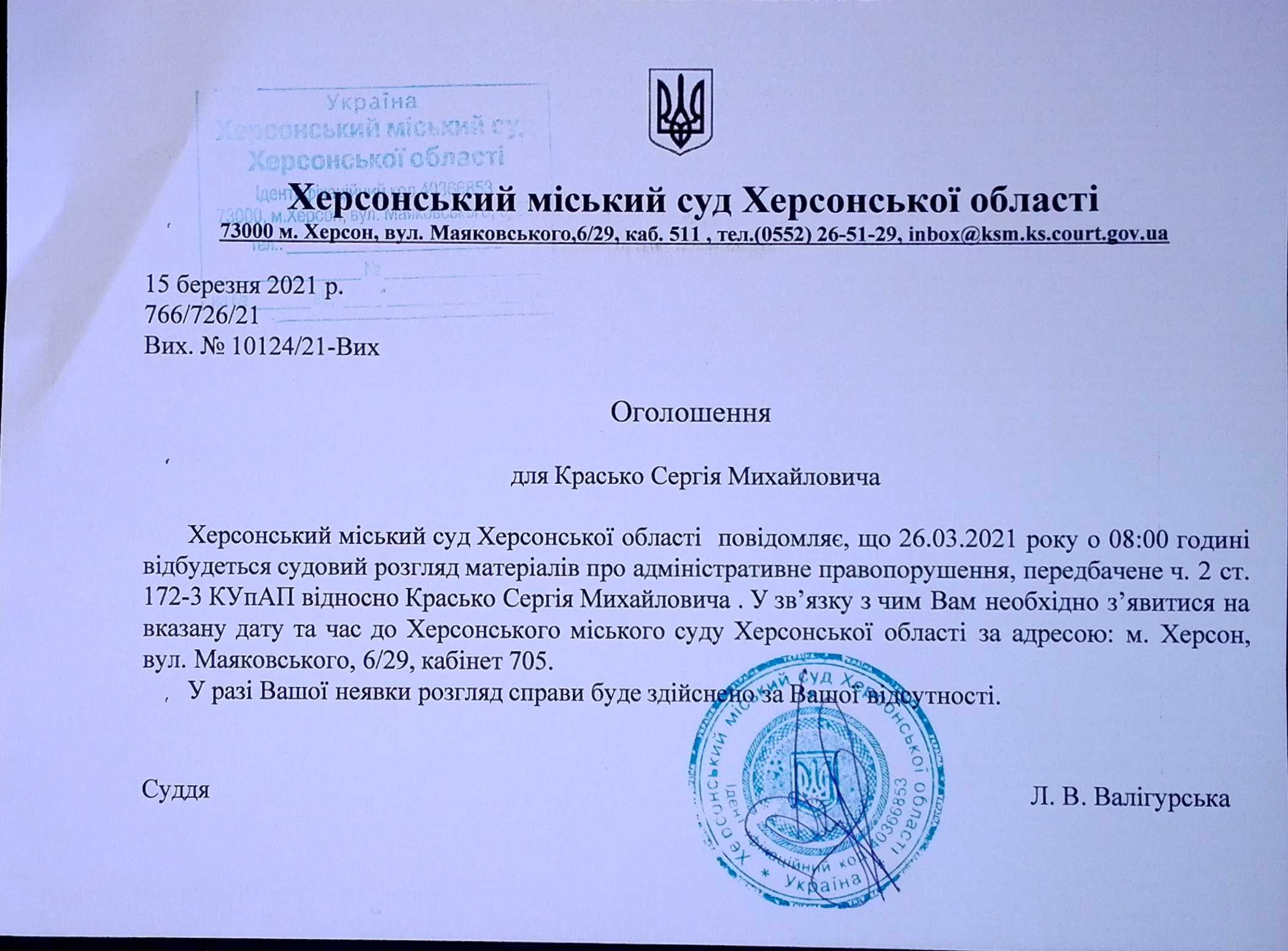 ОГОЛОШЕННЯ для Красько Сергія Михайловича