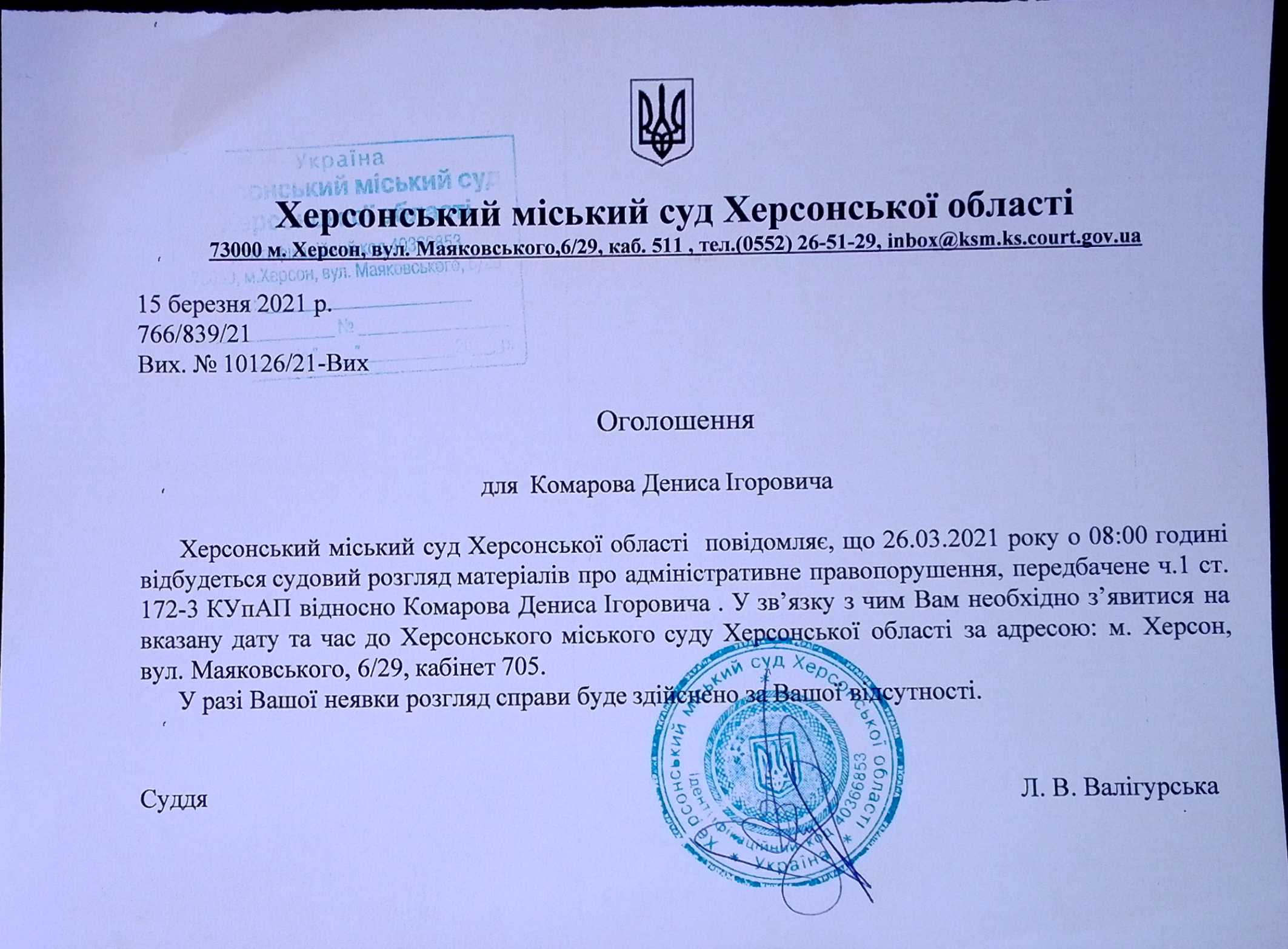 ОГОЛОШЕННЯ для Комарова Дениса Ігоровича